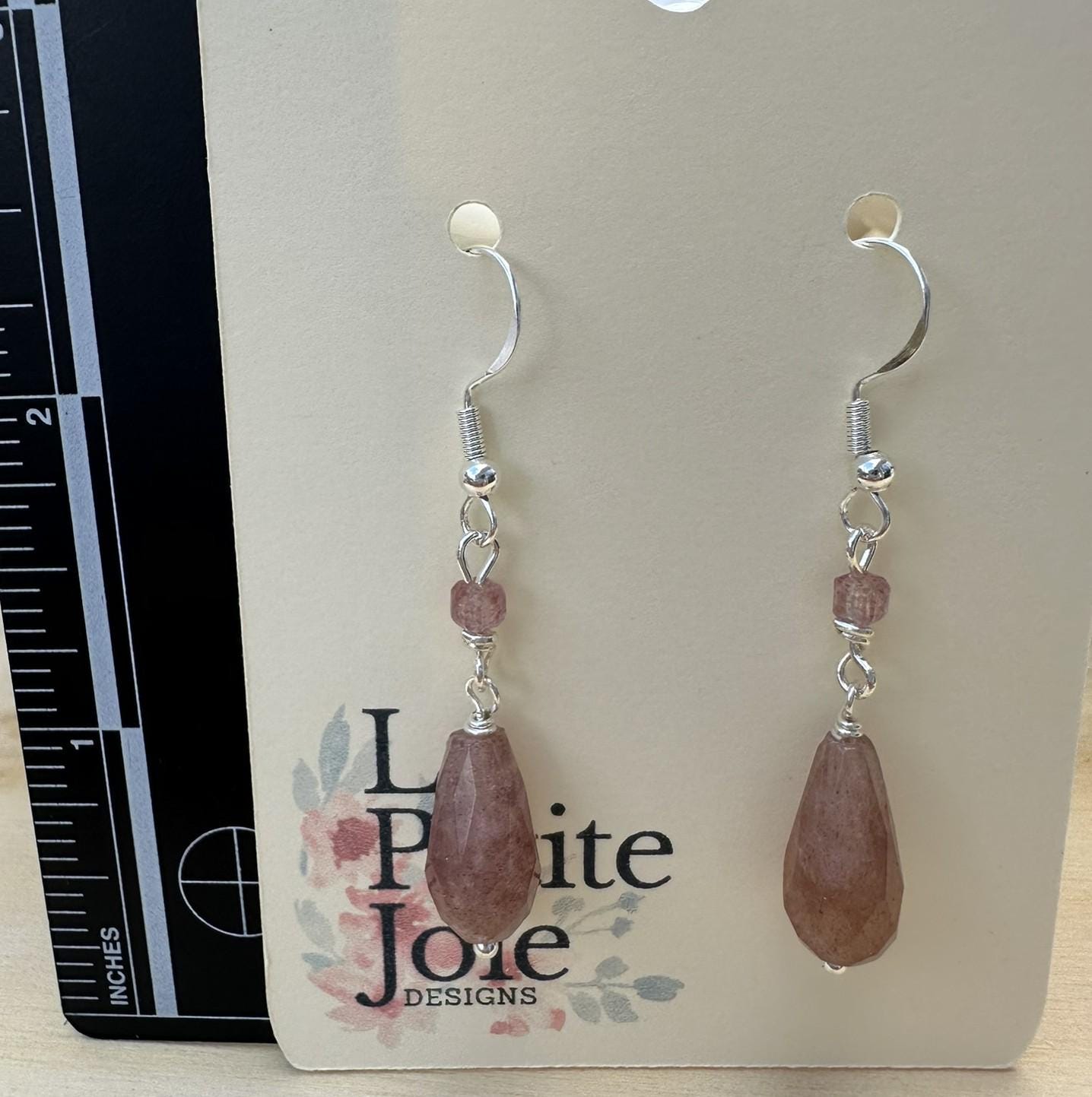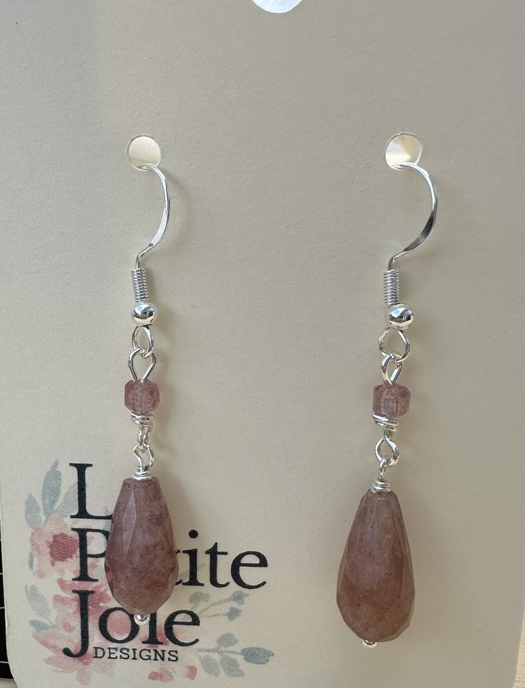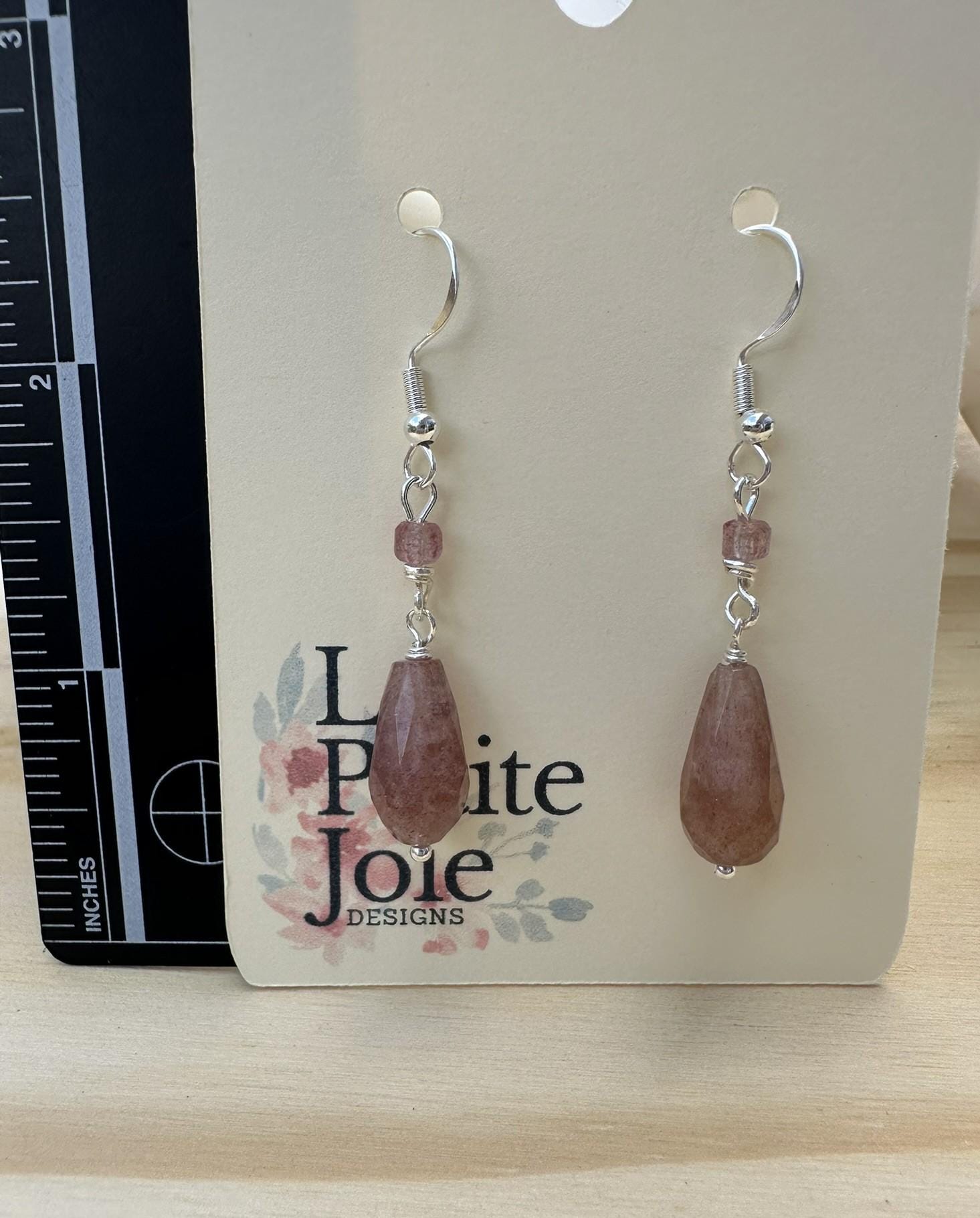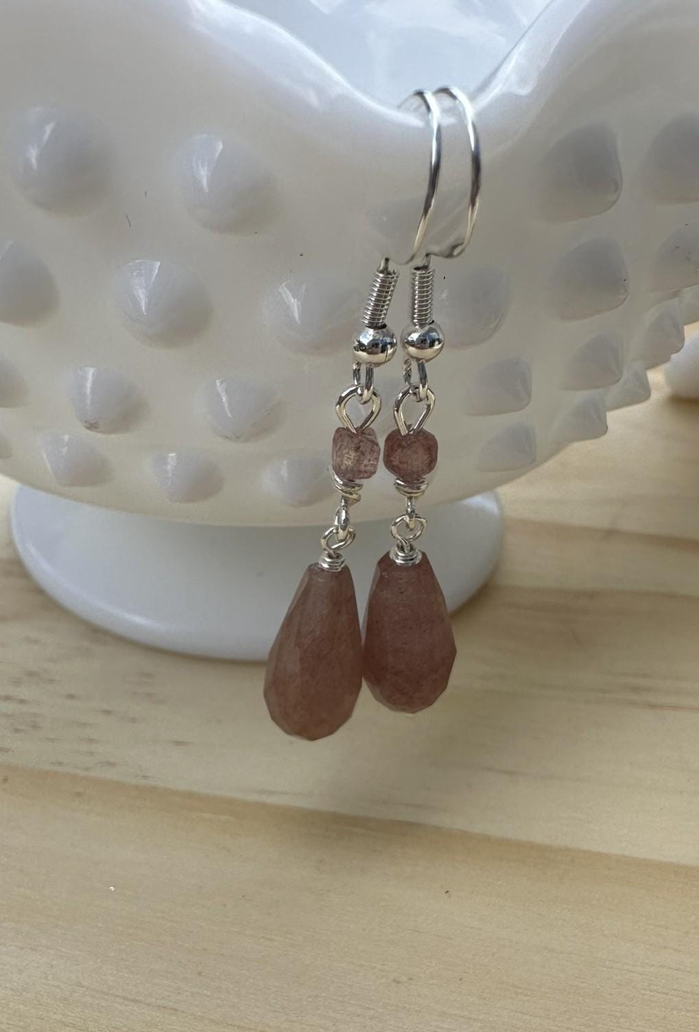 Faceted teardrops of strawberry quartz glow with soft, rosy-pink hues and shimmering inclusions that catch the light like tiny seeds within a berry. Set on graceful French wire hooks for effortless bohemian charm. Believed to radiate love, joy, and inner peace, strawberry quartz is said to open the heart and inspire positive energy.