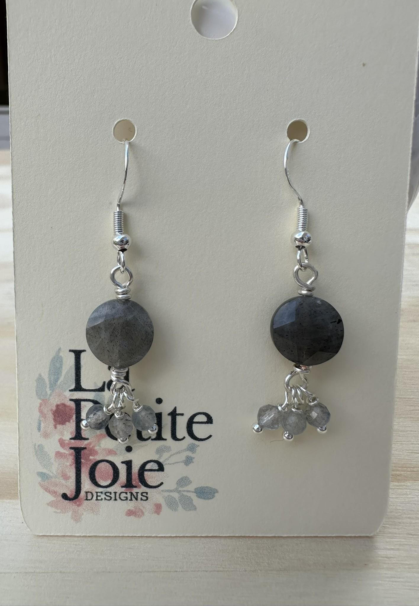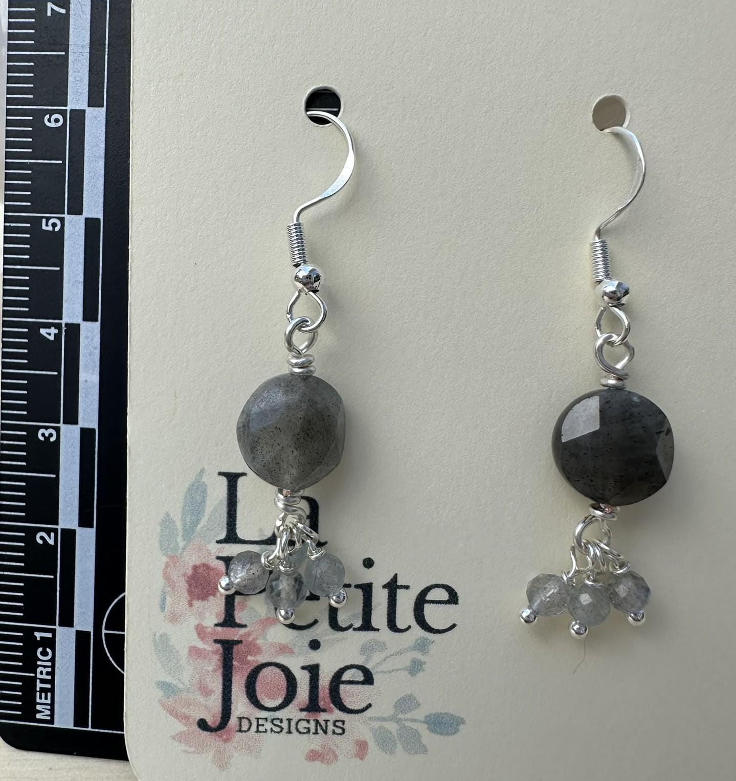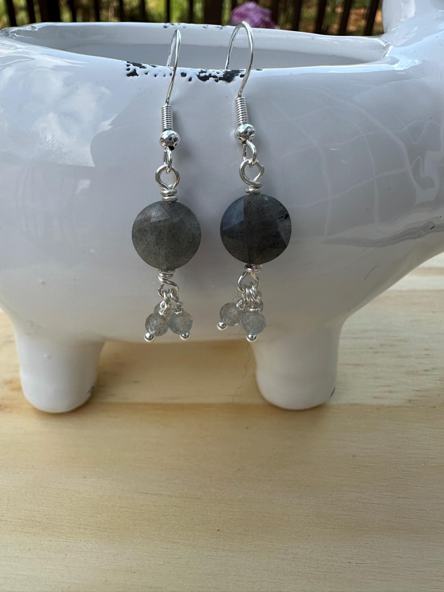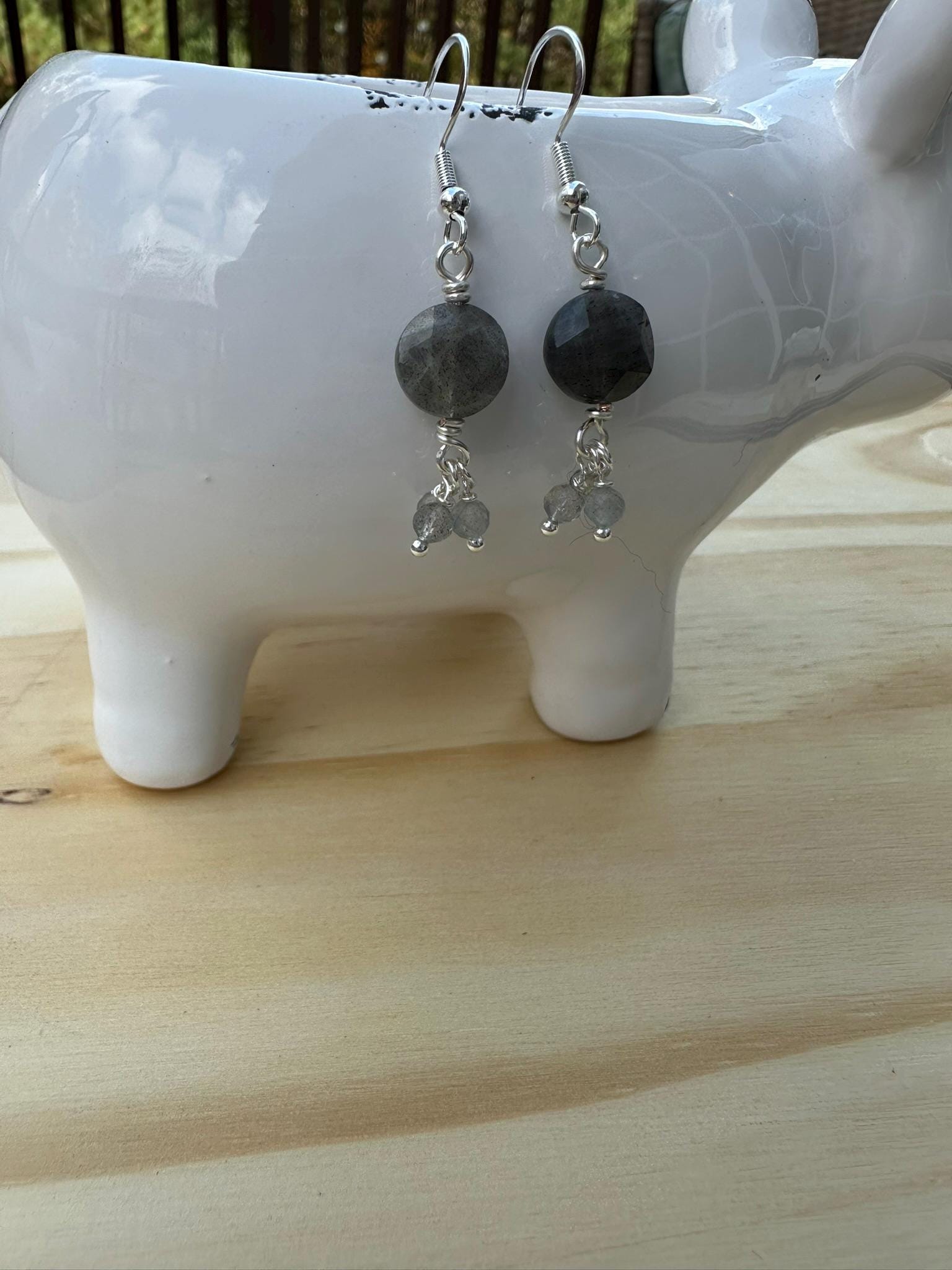 Labradorite faceted coin beads glow with shifting hues of blue fire and soft gray, reminiscent of moonlit skies. Believed to inspire transformation and inner strength, labradorite carries a calm, protective energy. Finished on French hooks — a touch of celestial beauty for the free-spirited soul. These earrings feature a 10 mm faceted coin bead, accented by three tiny (3 mm) faceted beads dangling below.