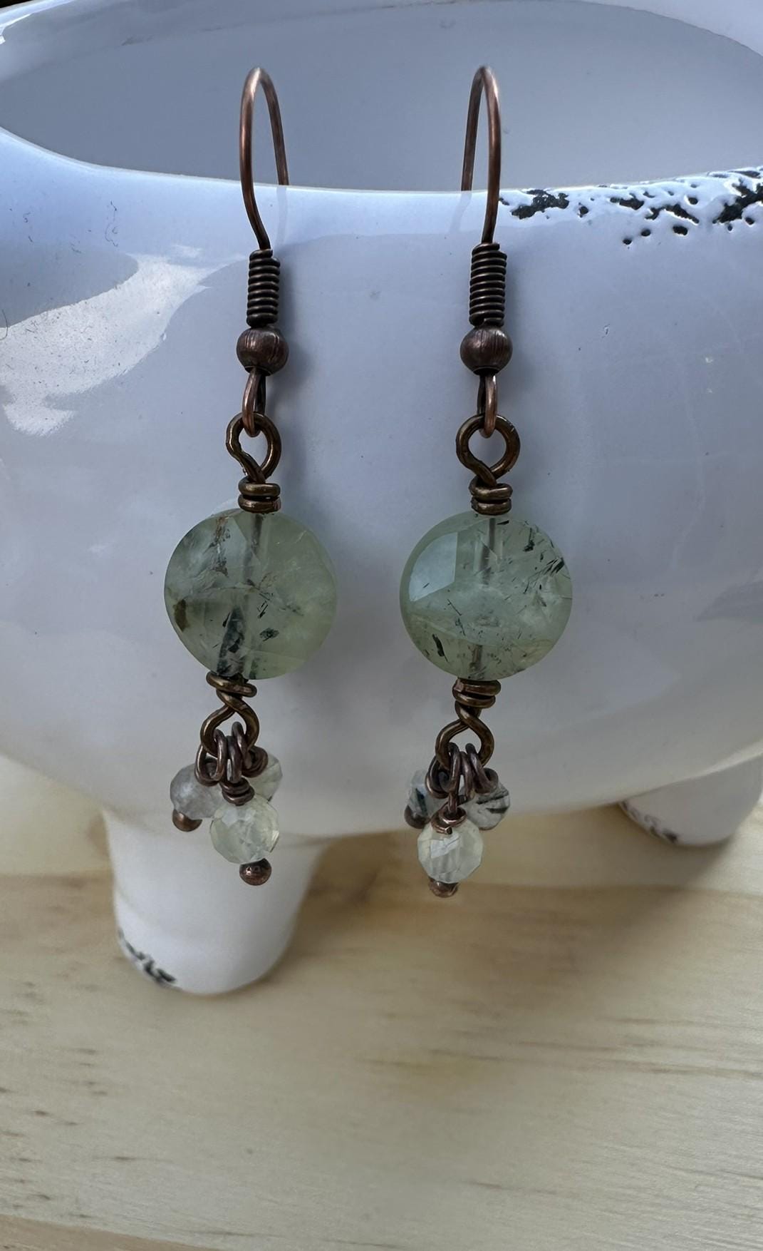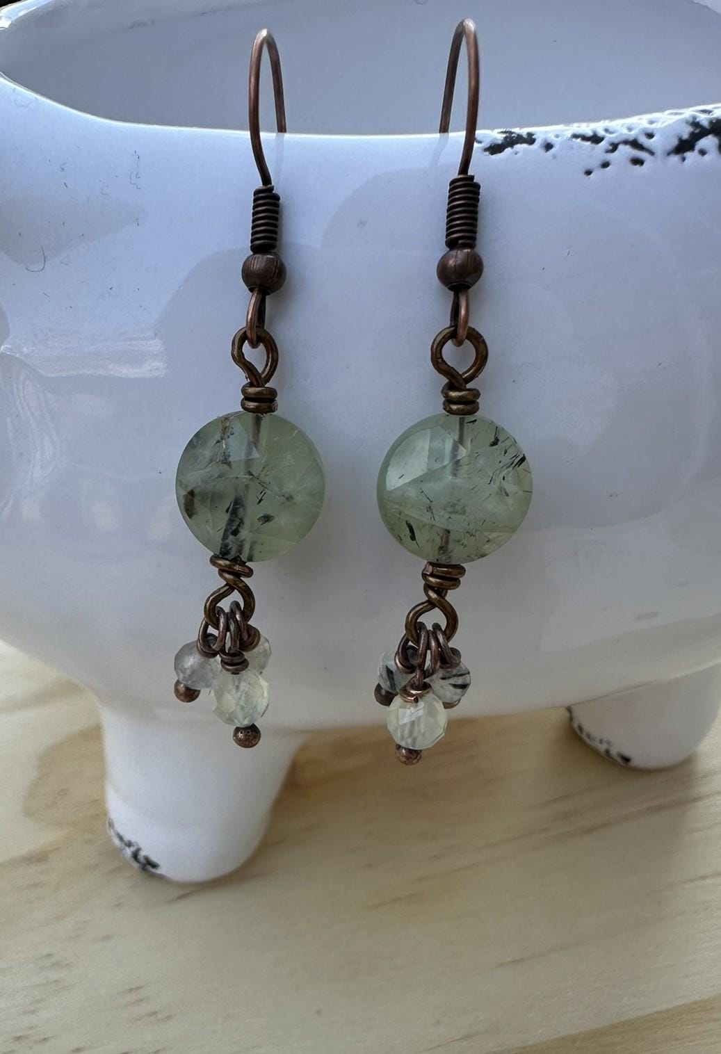 Handmade prehnite earrings with natural translucent green hues — fresh, calming, and full of light. Known as the stone of peace and renewal, prehnite is said to nurture the heart and soothe the spirit. Faceted, 10 mm coin drops on French hooks — boho gemstone jewelry with a touch of mindful beauty.