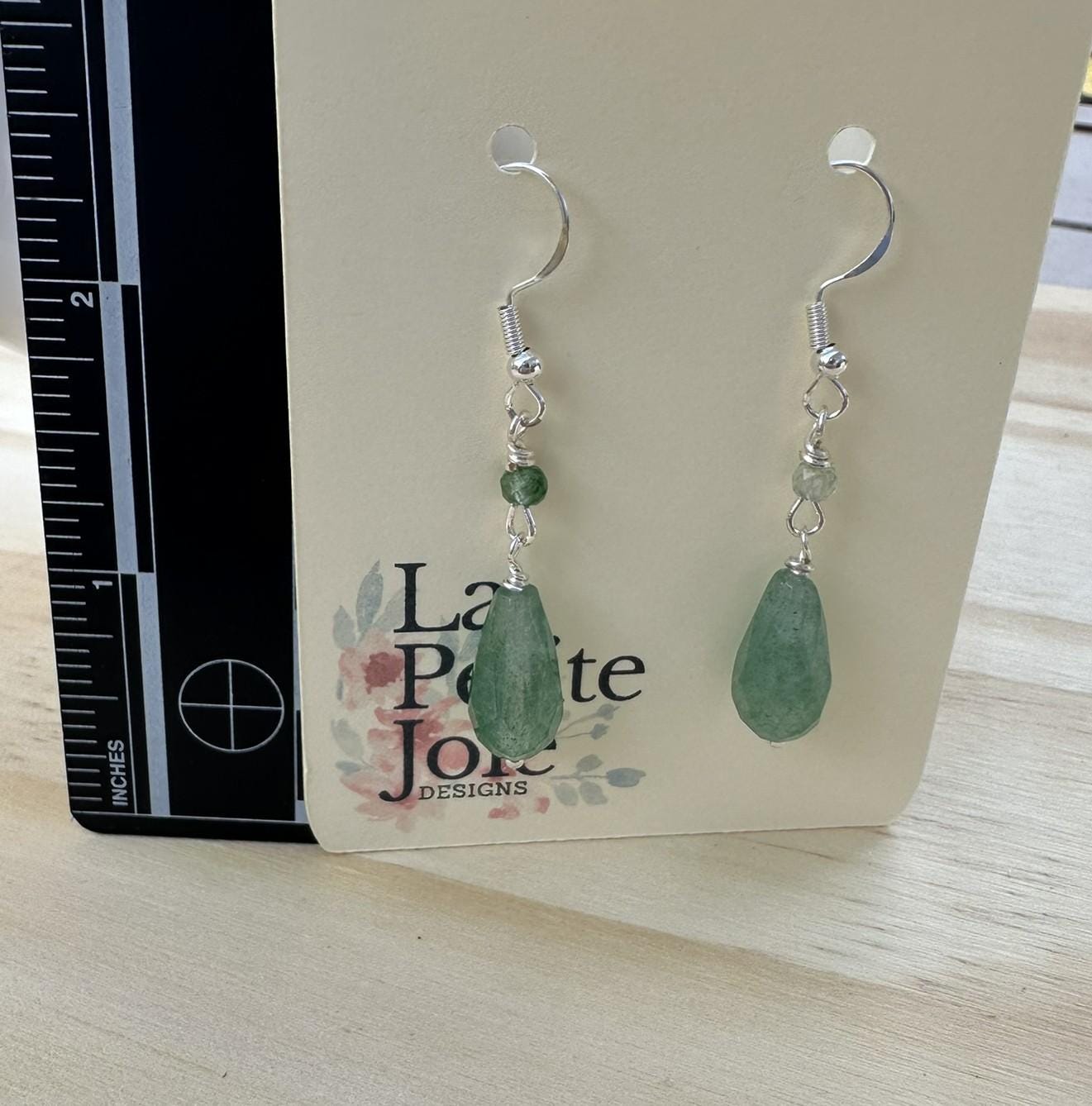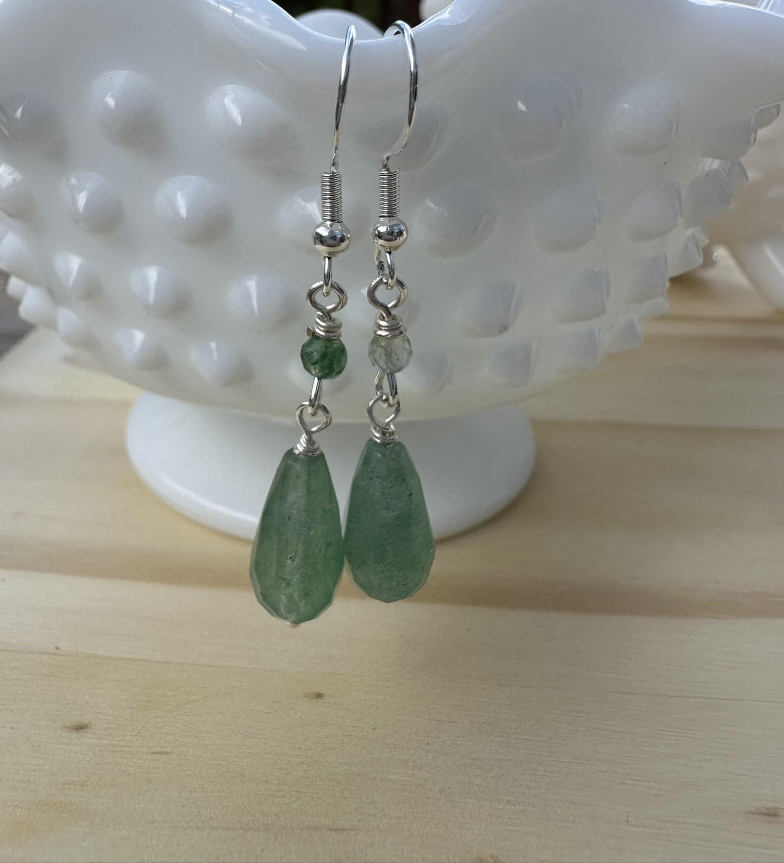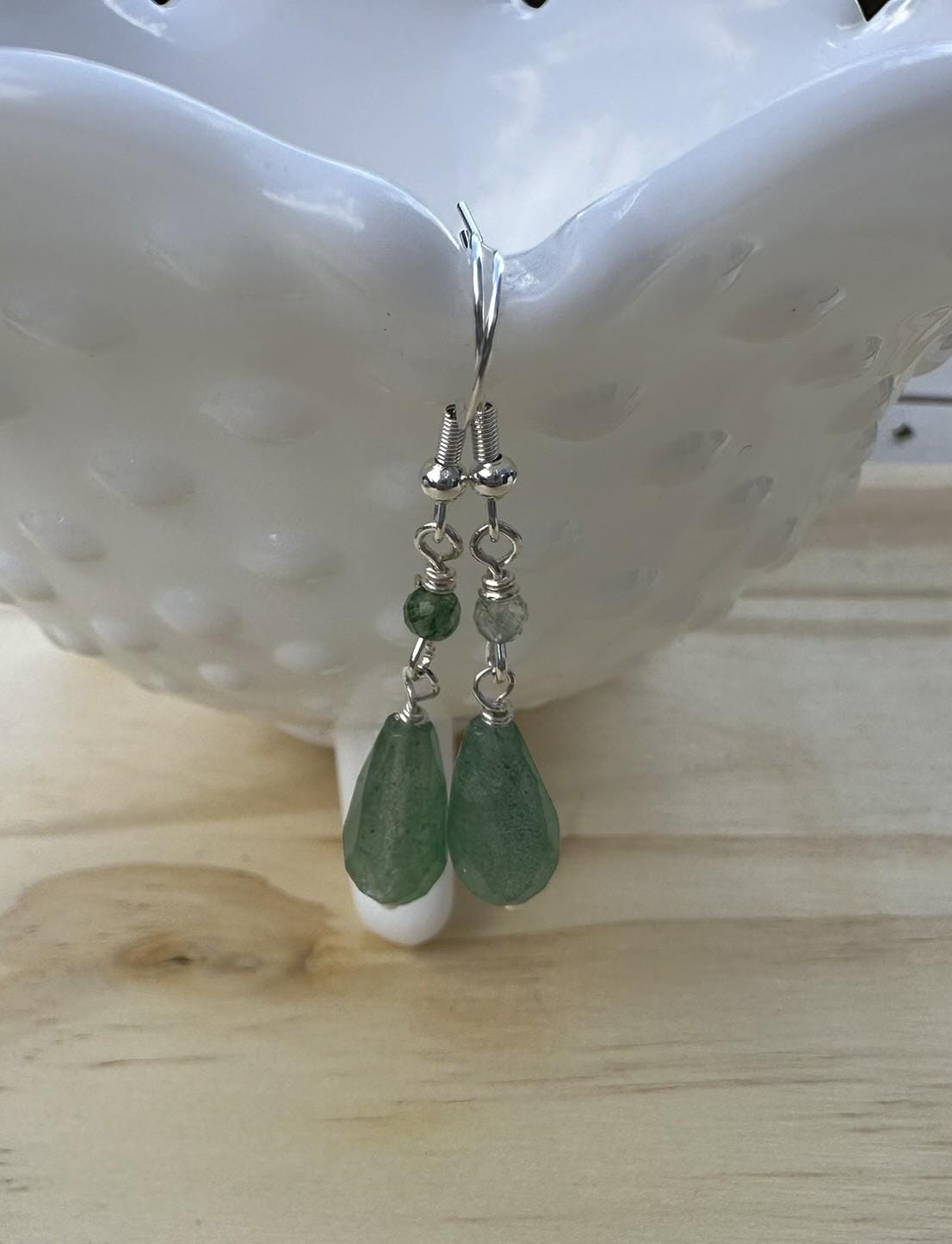 Handcrafted with faceted green strawberry quartz teardrops, these earrings shimmer with a soft, natural glow with hues of mossy green that feel both earthy and romantic. Finished on French hooks for graceful movement and a touch of bohemian charm.