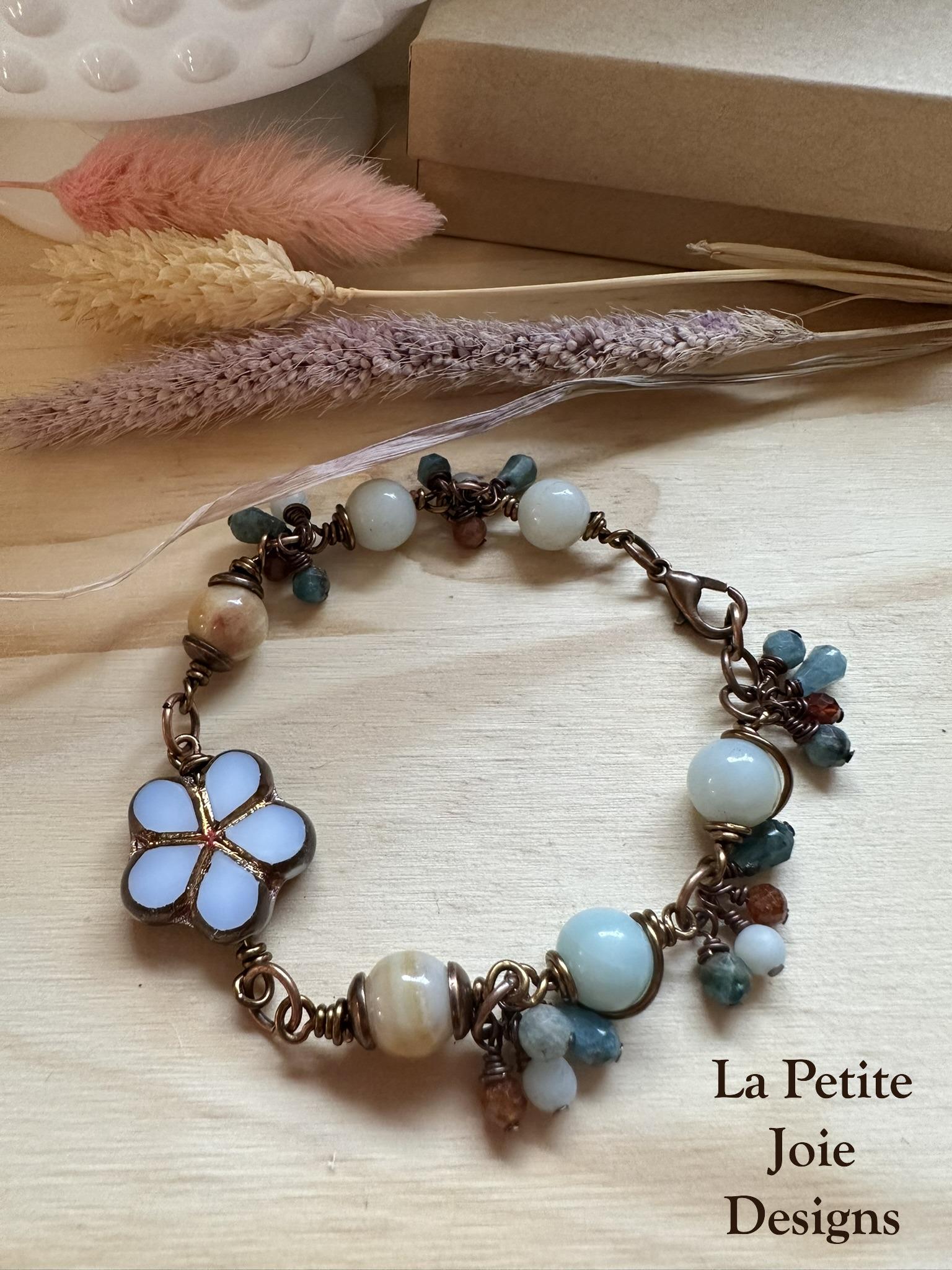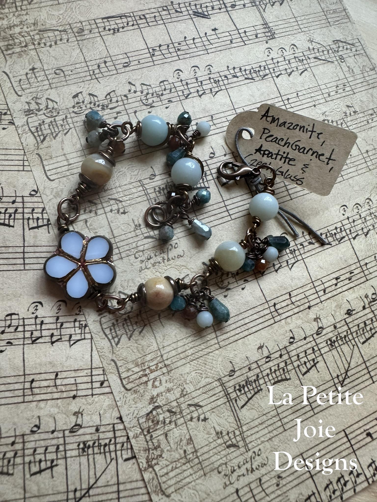Wire wrap beaded bracelet with 8mm Amazonite beads and a light blue, Czech glass flower bead at the center creating a soft, calming design. This handcrafted bracelet measures 7.5 inches long and is accented with delicate gemstone dangles made with light blue Amazonite, dark blue Apatite, and faceted peach garnet beads.