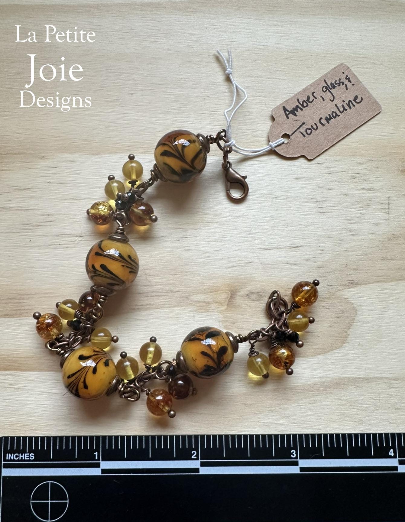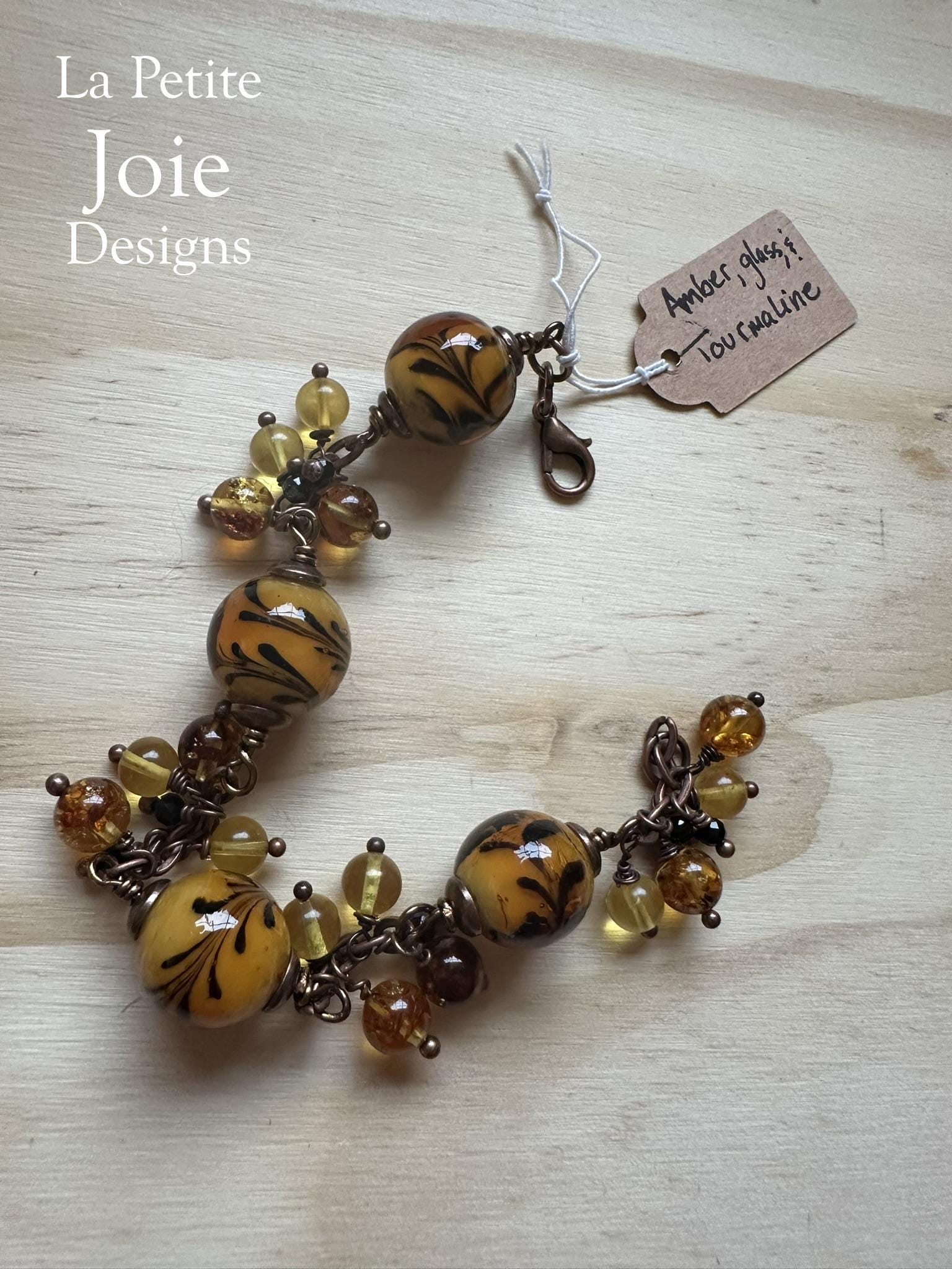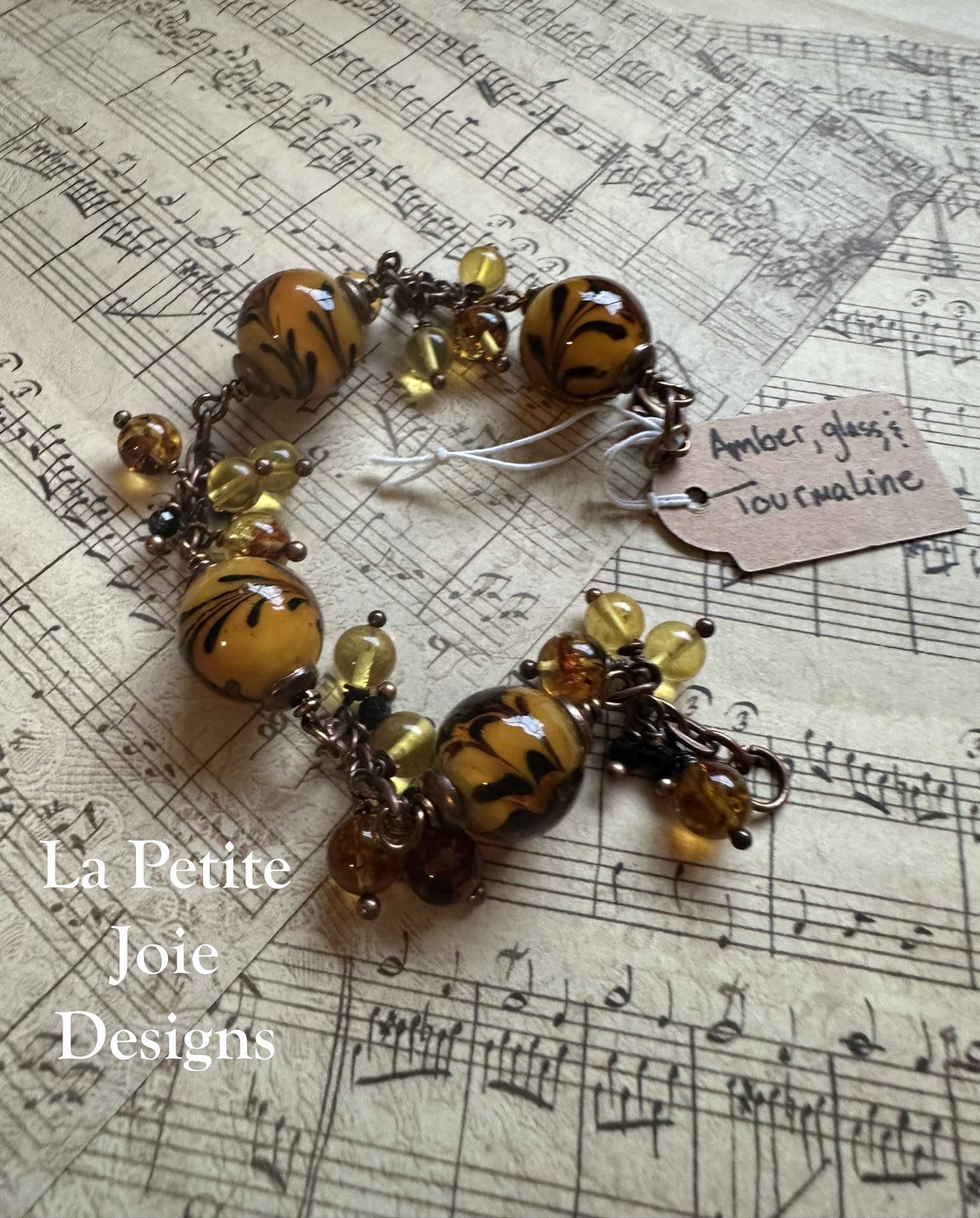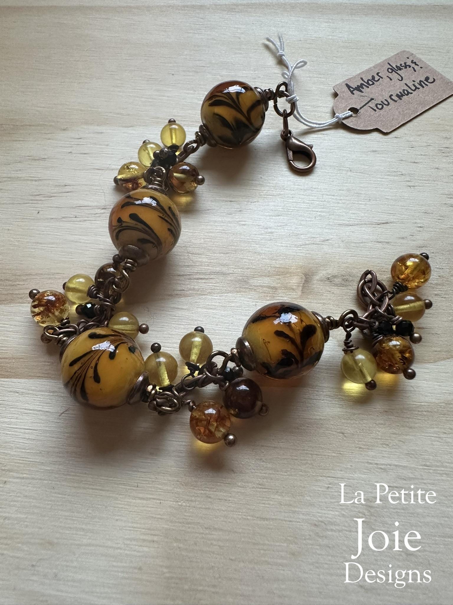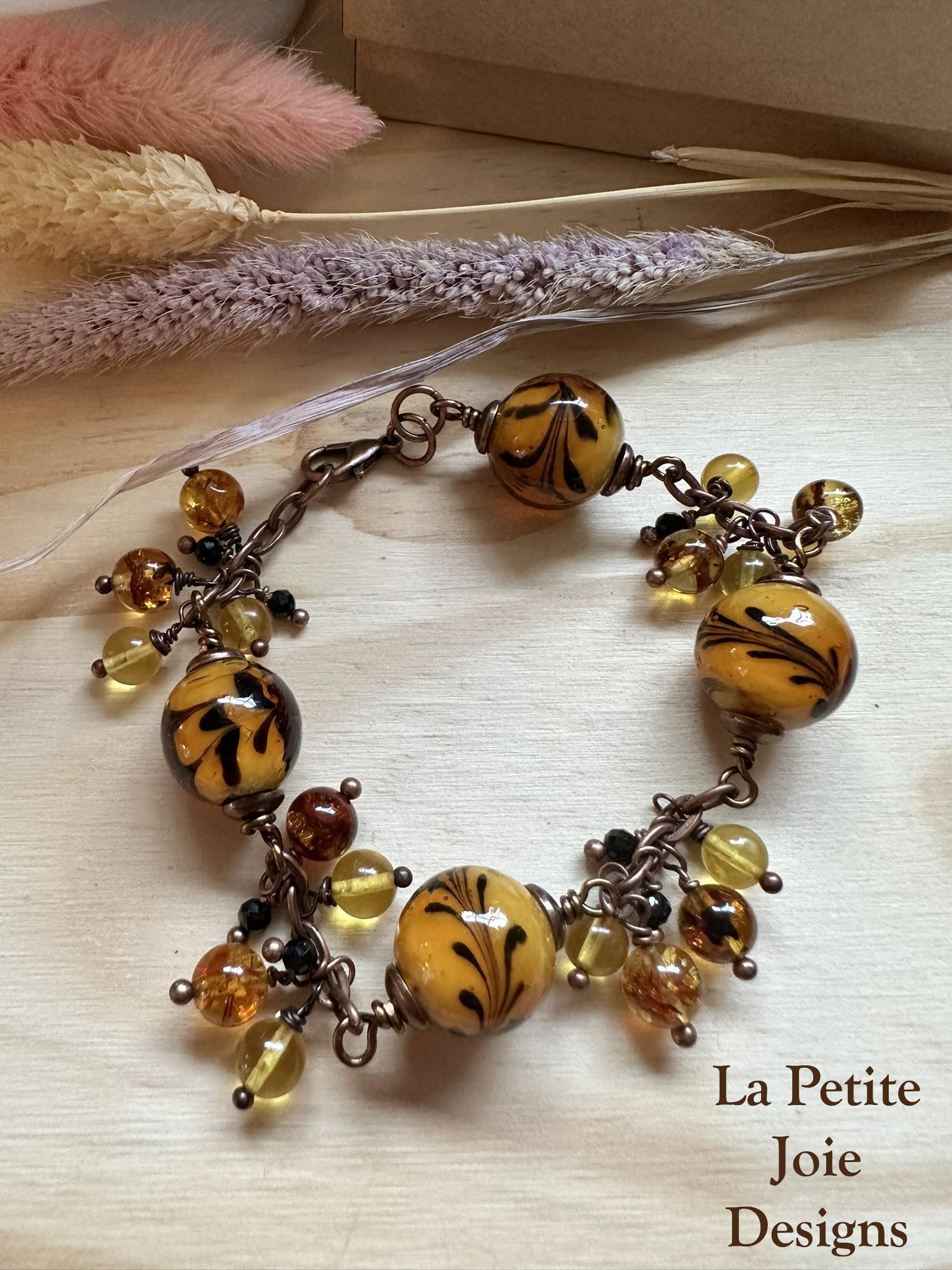 This vibrant wire-wrapped bracelet features bold 10mm yellow glass beads adorned with delicate black flower details, creating a striking and artistic focal point. Between each large bead, rich honey-colored, golden yellow, and deep brown amber drops sway gently, adding warm, earthy movement with every flick of the wrist. Small black tourmaline beads serve as grounding accents, balancing the bright color palette with a touch of protective, natural energy.