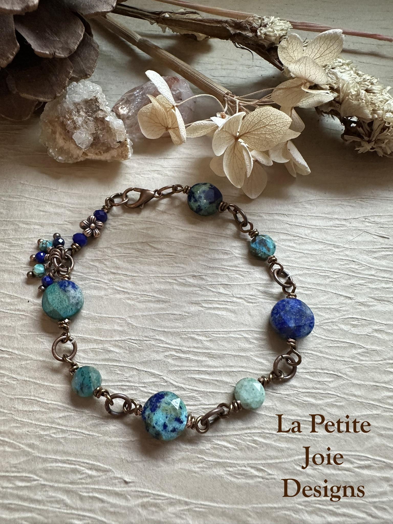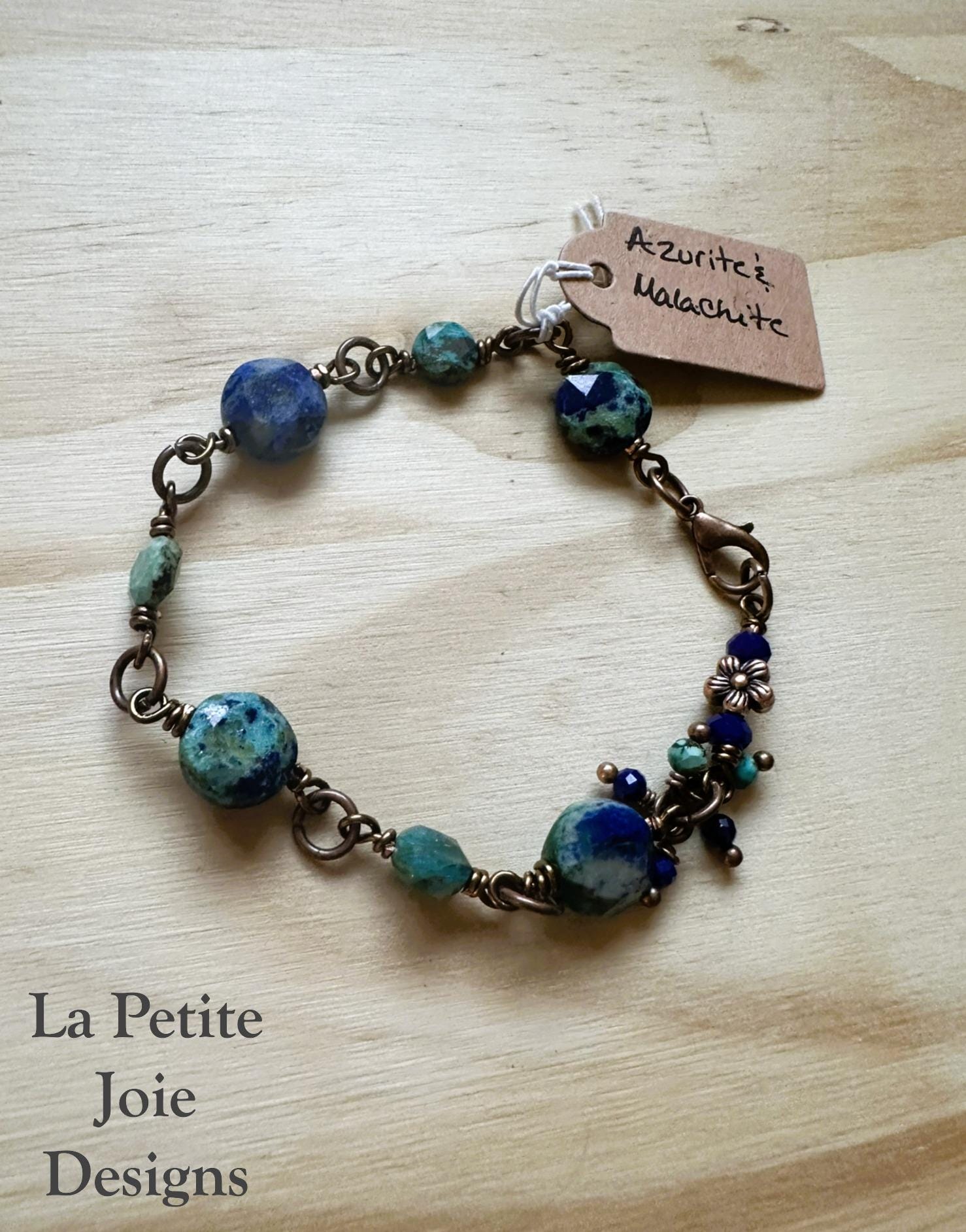 This Azurite-Malachite and Chrysocolla bracelet is a stunning hand-wrapped gemstone piece featuring beautiful faceted puff coin beads accented with rich 3mm lapis lazuli, turquoise, and coordinating glass beads. The natural blend of deep blues and vibrant greens creates a bold yet earthy blue and green gemstone bracelet that is both eye-catching and meaningful.