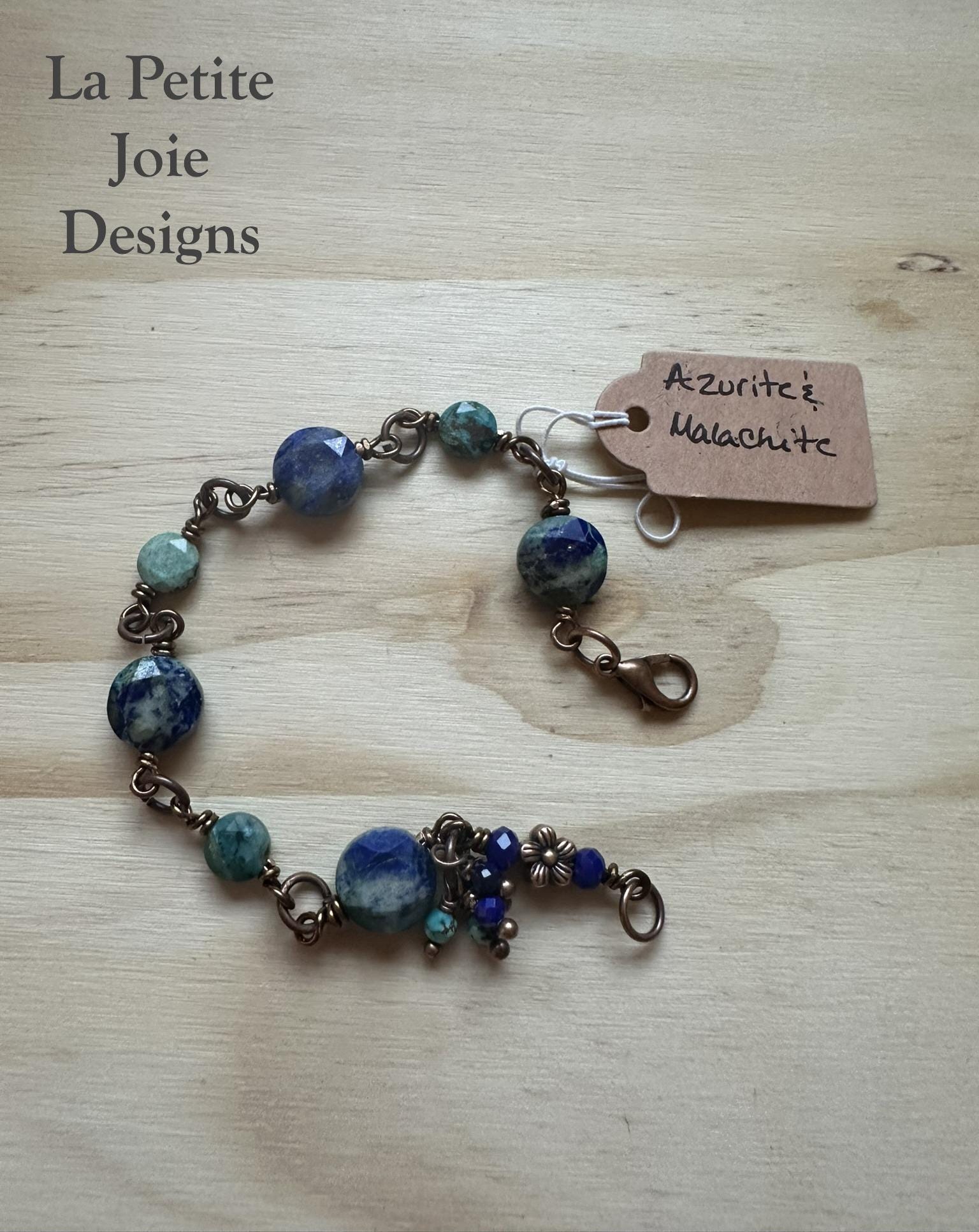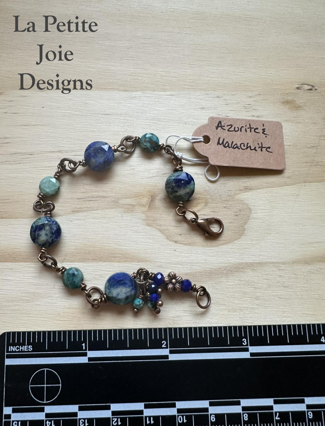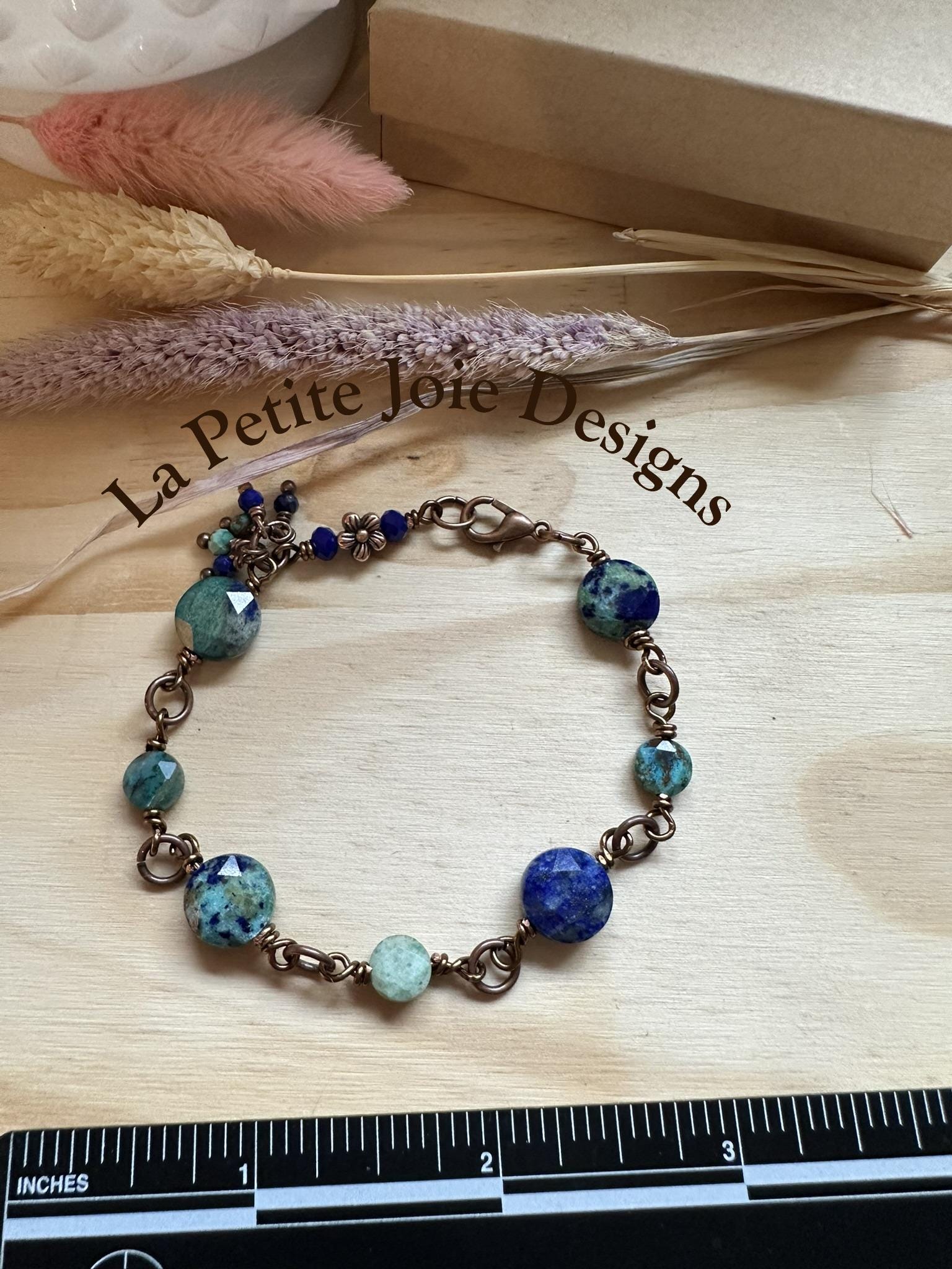 Each bead is carefully wire-wrapped by hand, giving this artisan gemstone bracelet a delicate, detailed finish while maintaining strength and durability. The natural patterns found in azurite-malachite and chrysocolla ensure that every bracelet is truly one of a kind.