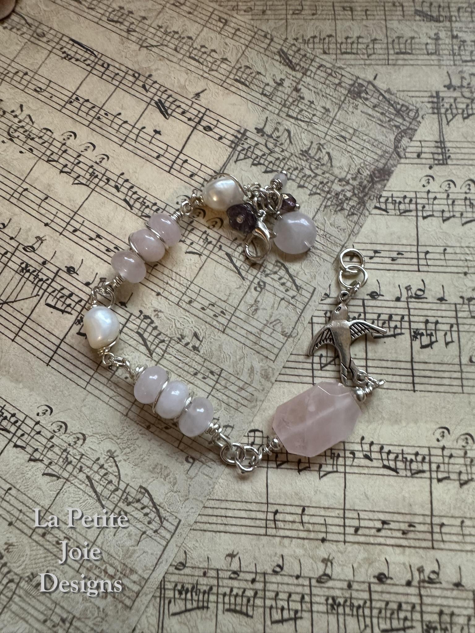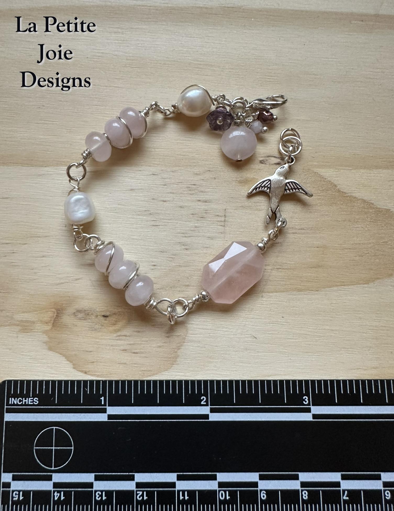 This romantic rose quartz bracelet features a striking faceted, rectangular rose quartz centerpiece, delicately framed by wire-wrapped rose quartz rondelle beads with soft white irregular-shaped pearl accents. A charming silver bird bead adds a sweet symbolic touch, while playful bead dangles at one end create gentle movement and a whimsical, artisan finish.