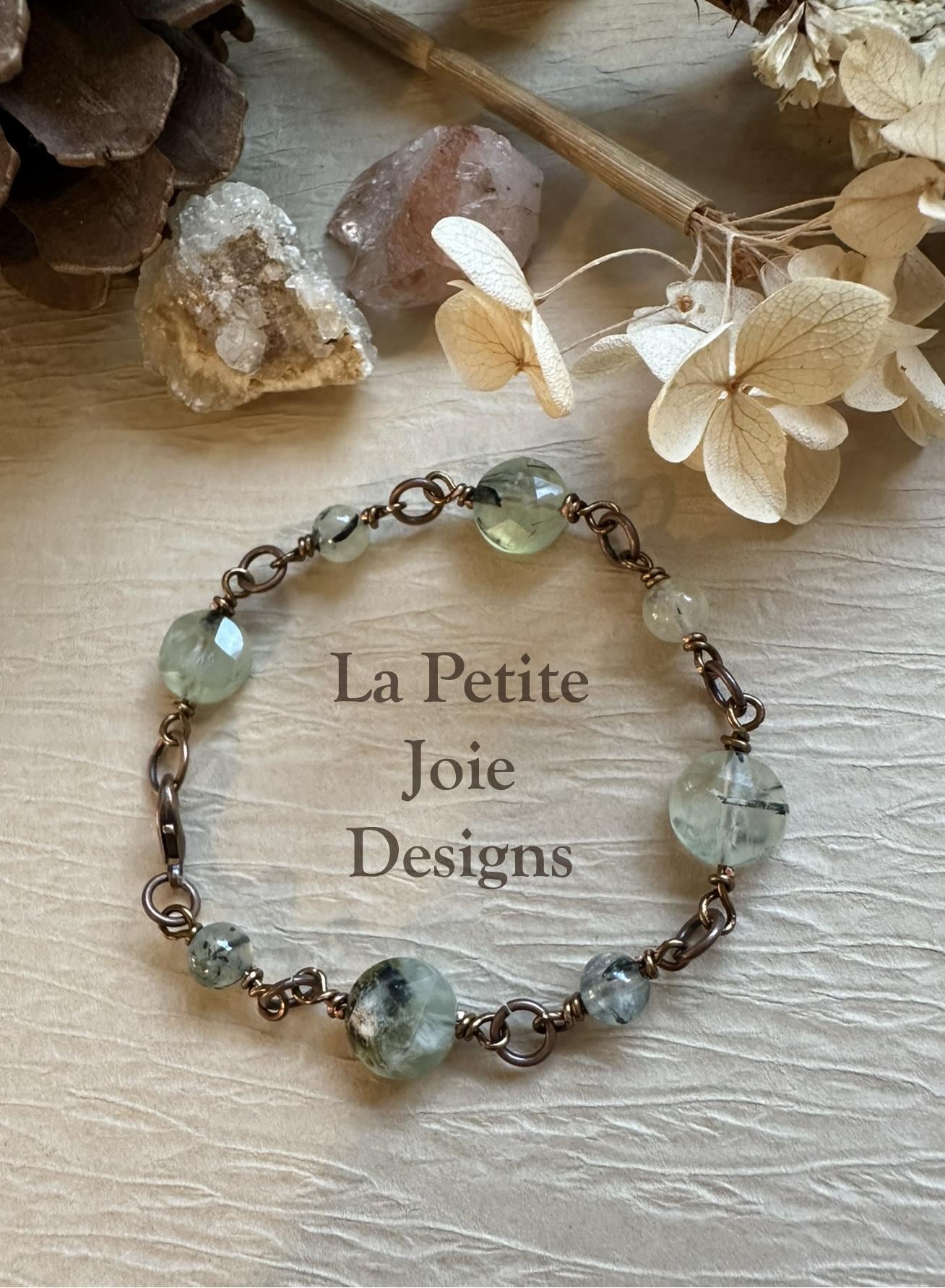 This serene prehnite bracelet features a beautiful combination of faceted prehnite coin beads and smooth, 6mm round prehnite beads, all expertly wire-wrapped with rich antique bronze wire for a warm, earthy finish. The soft, luminous green tones of prehnite glow gently against the bronze, creating a bracelet that feels both grounding and elegant.