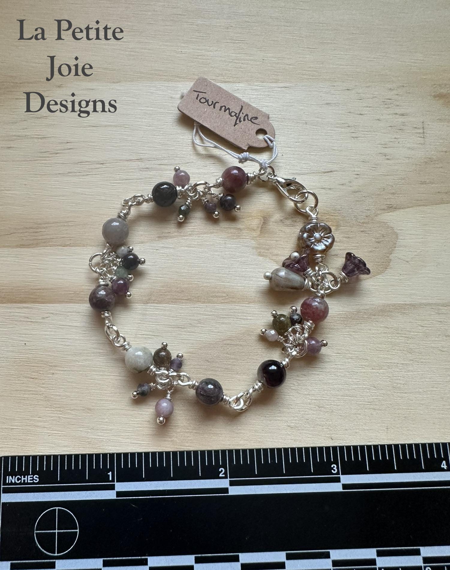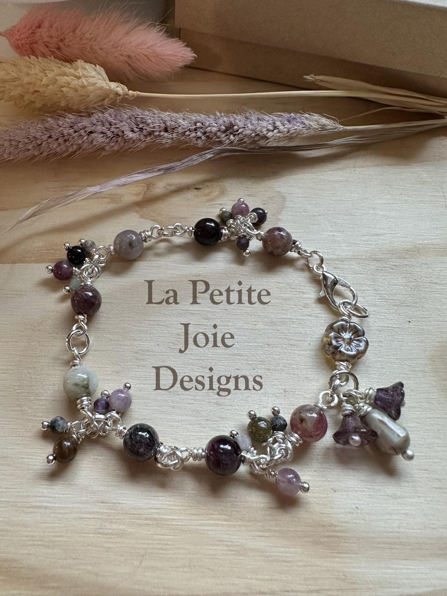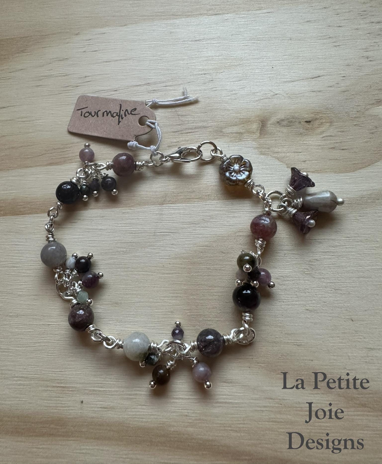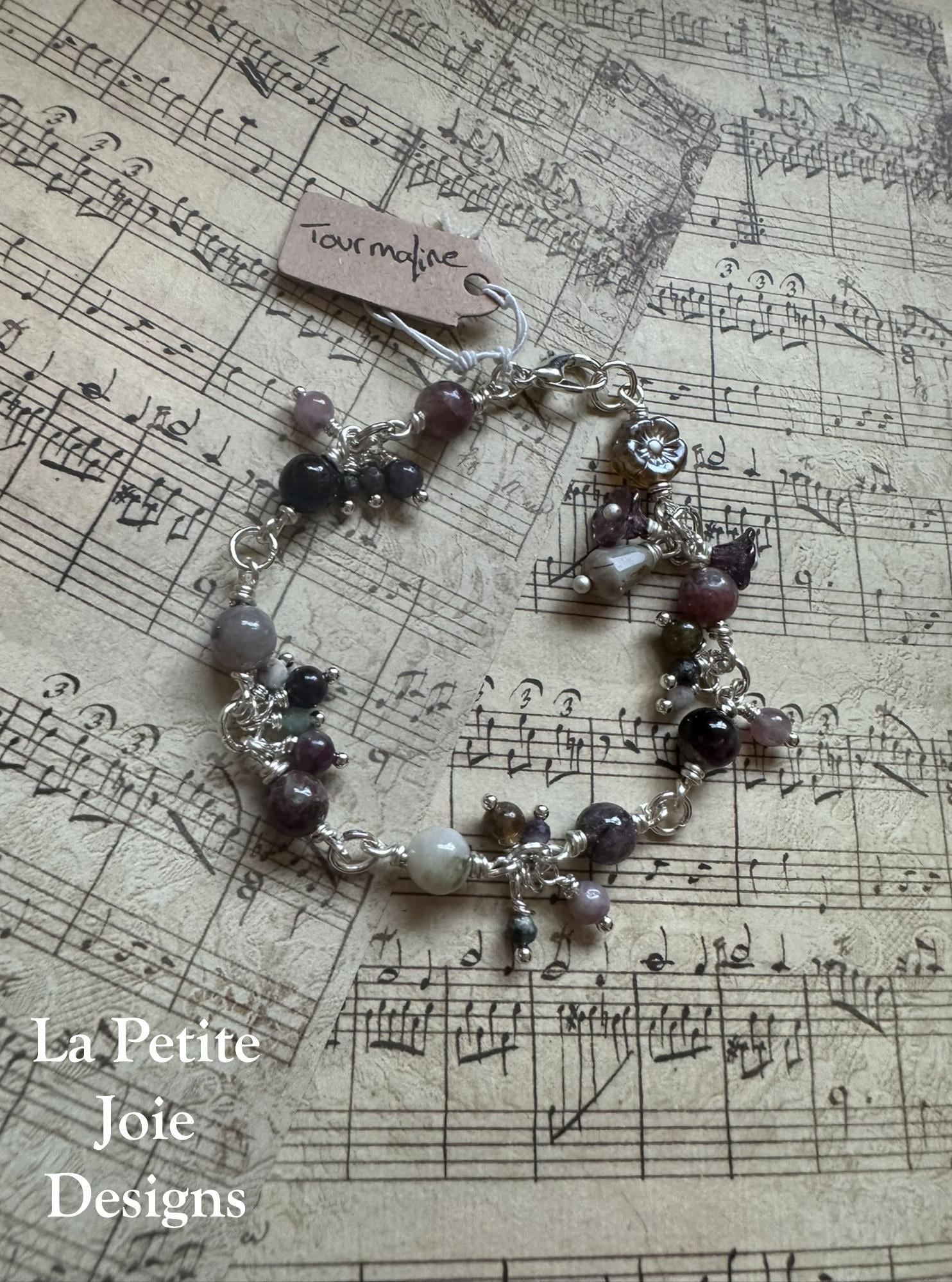 With its naturally blended shades of pink, white, grey, and ruby tourmaline is known for its uplifting energy and heart-centered beauty. The mix of wrapped gemstones, soft dangles, and floral glass details creates a bracelet that feels whimsical, artistic, and beautifully balanced.