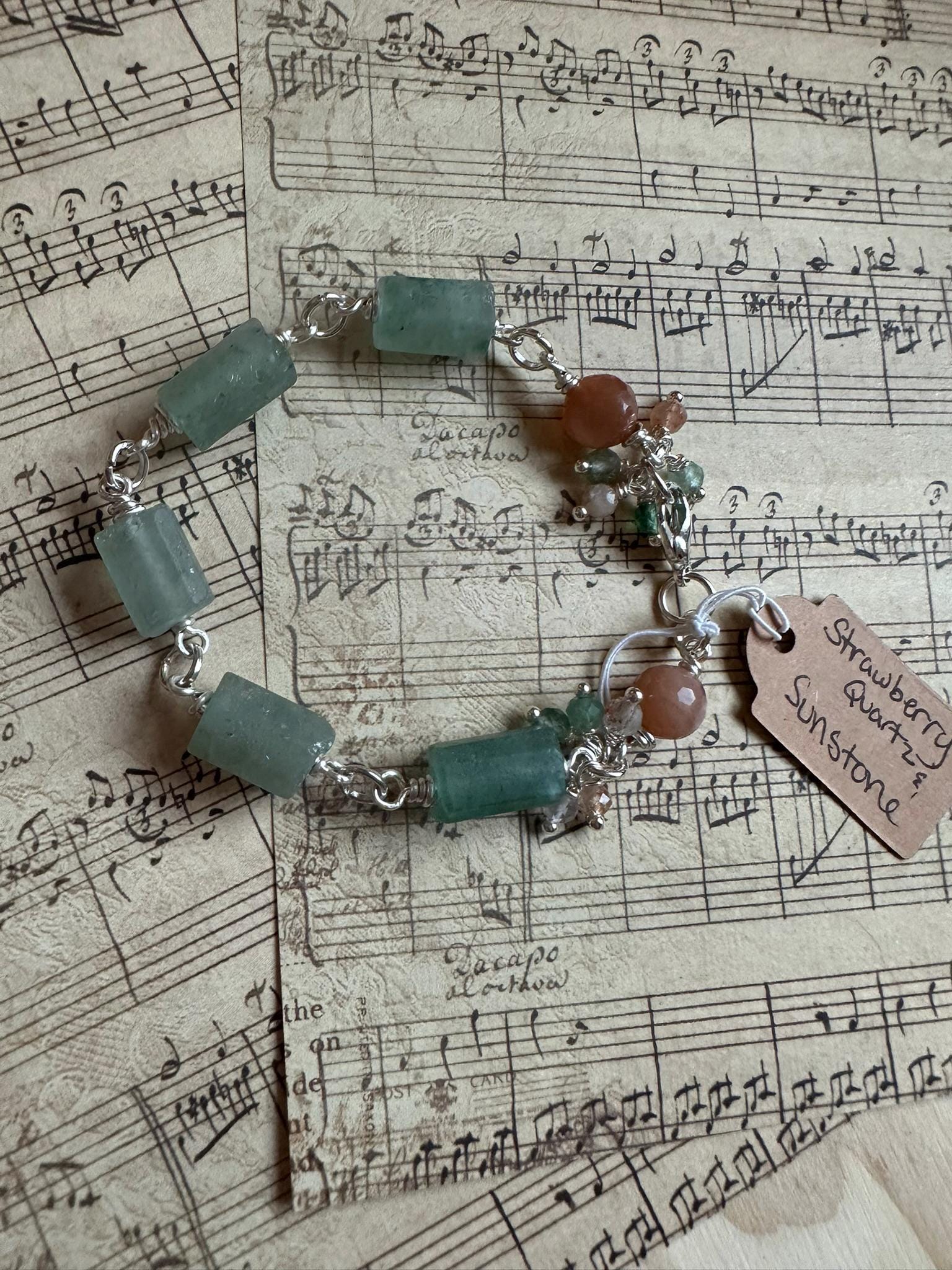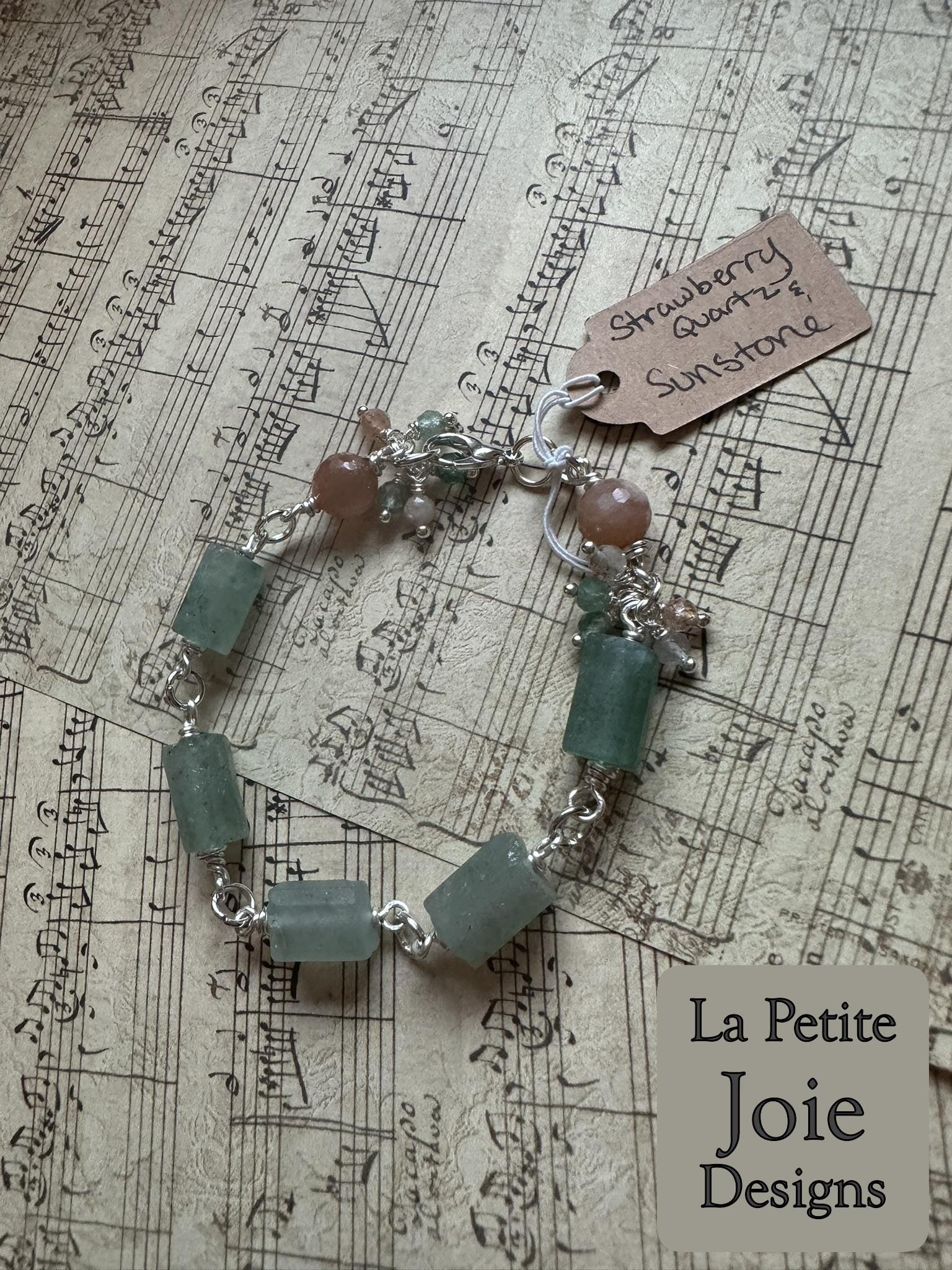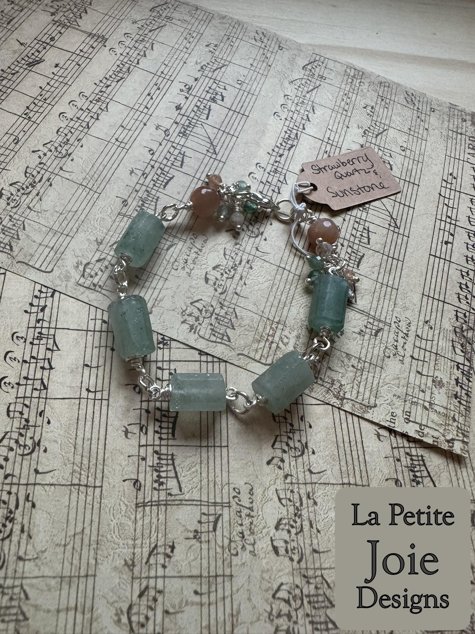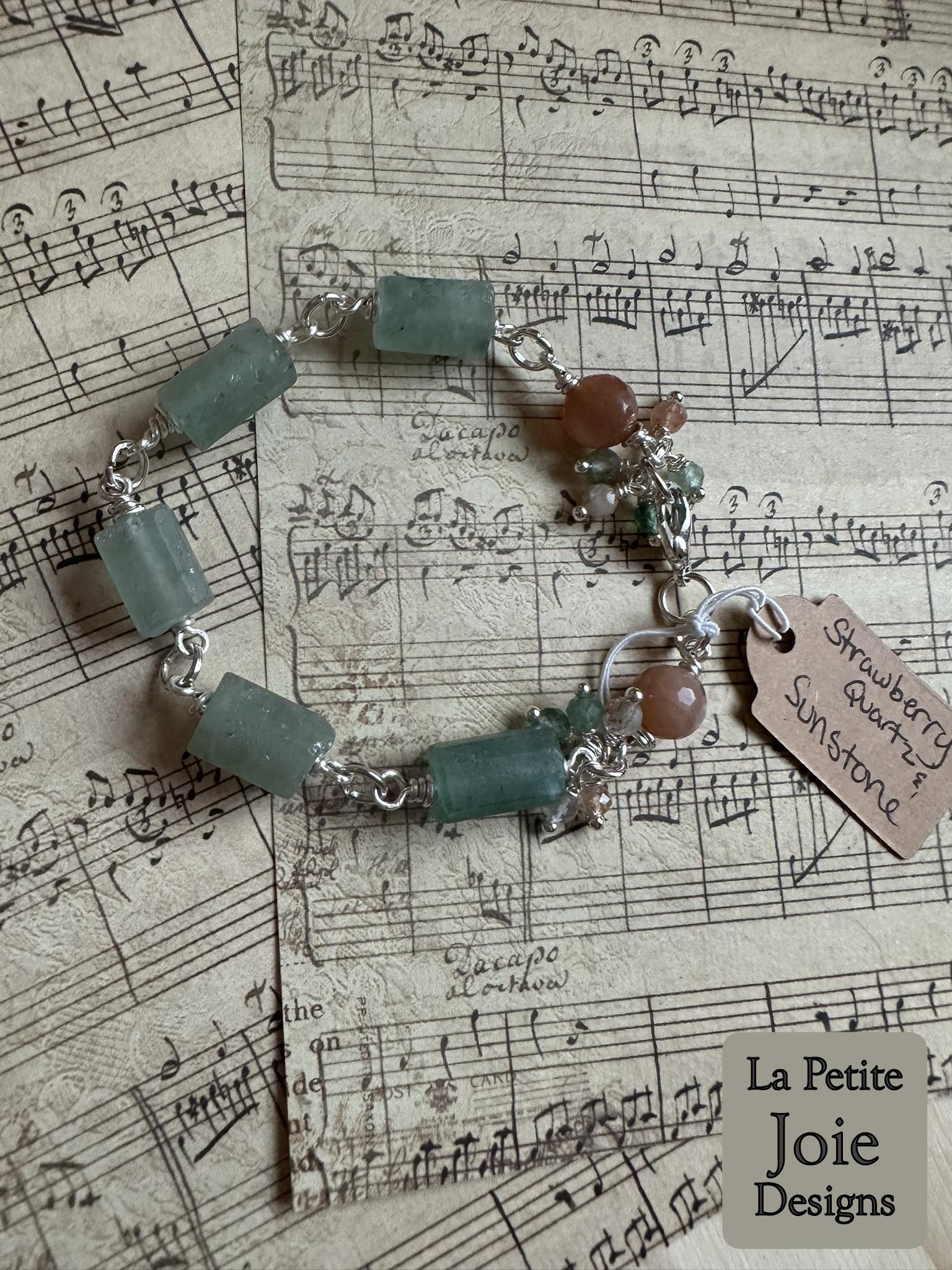 This tranquil green strawberry quartz bracelet features softly glowing, matte-finish green strawberry quartz barrel beads, beautifully accented with faceted round sunstone beads at each end for a subtle touch of golden sparkle. Delicate bead dangles add gentle movement and charm, creating a bracelet that feels breezy, peaceful, and effortlessly coastal.