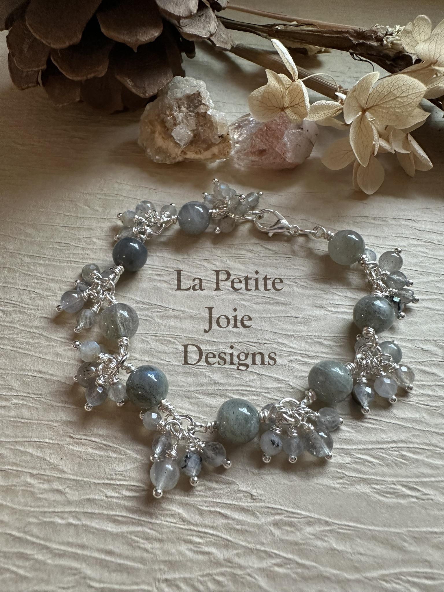 This handcrafted bracelet showcases luminous 8mm smooth, round labradorite beads, individually hand wire-wrapped with silver-plated wire to create a fluid, elegant design. The natural beauty of labradorite is highlighted by its soft gray base and flashes of blue, green, and subtle gold tones that appear as the light moves across the stones. Delicate labradorite drop dangles hang gracefully between the round beads, adding movement and an extra touch of shimmer. These small accents enhance the bracelet’s depth and dimension while maintaining a refined, balanced look.