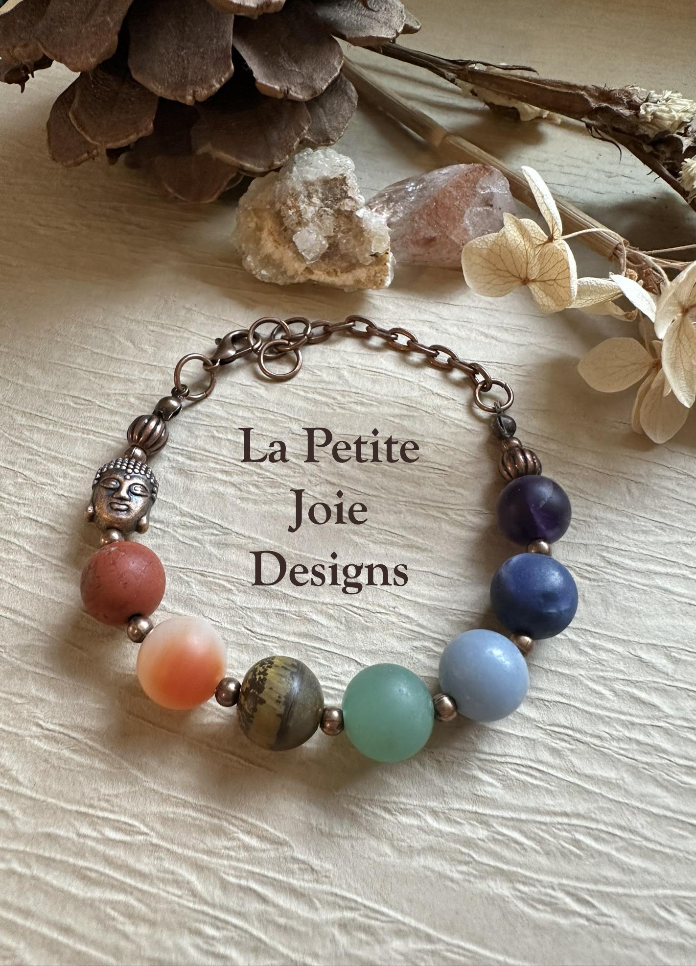 Bring balance, mindfulness, and earthy style to your everyday look with this handcrafted chakra bracelet, featuring smooth round matte gemstones paired with a rustic antique copper Buddha bead. Each stone was selected to represent the seven chakras; creating a harmonious blend of grounding neutrals and colors meant to inspire clarity an calm. The matte finish offers soft, nature texture, while the antique copper Buddha accent adds a touch of spiritual charm.