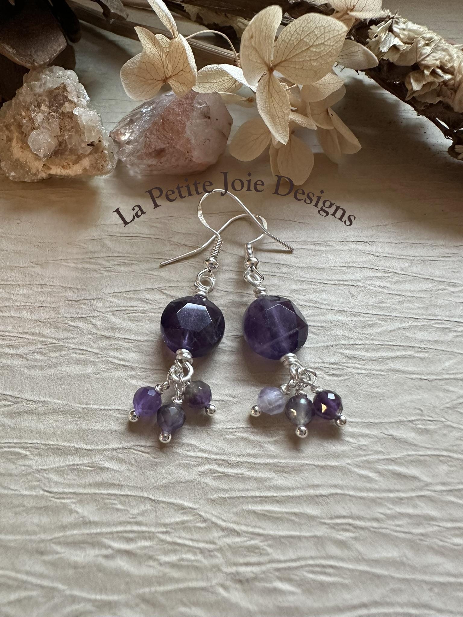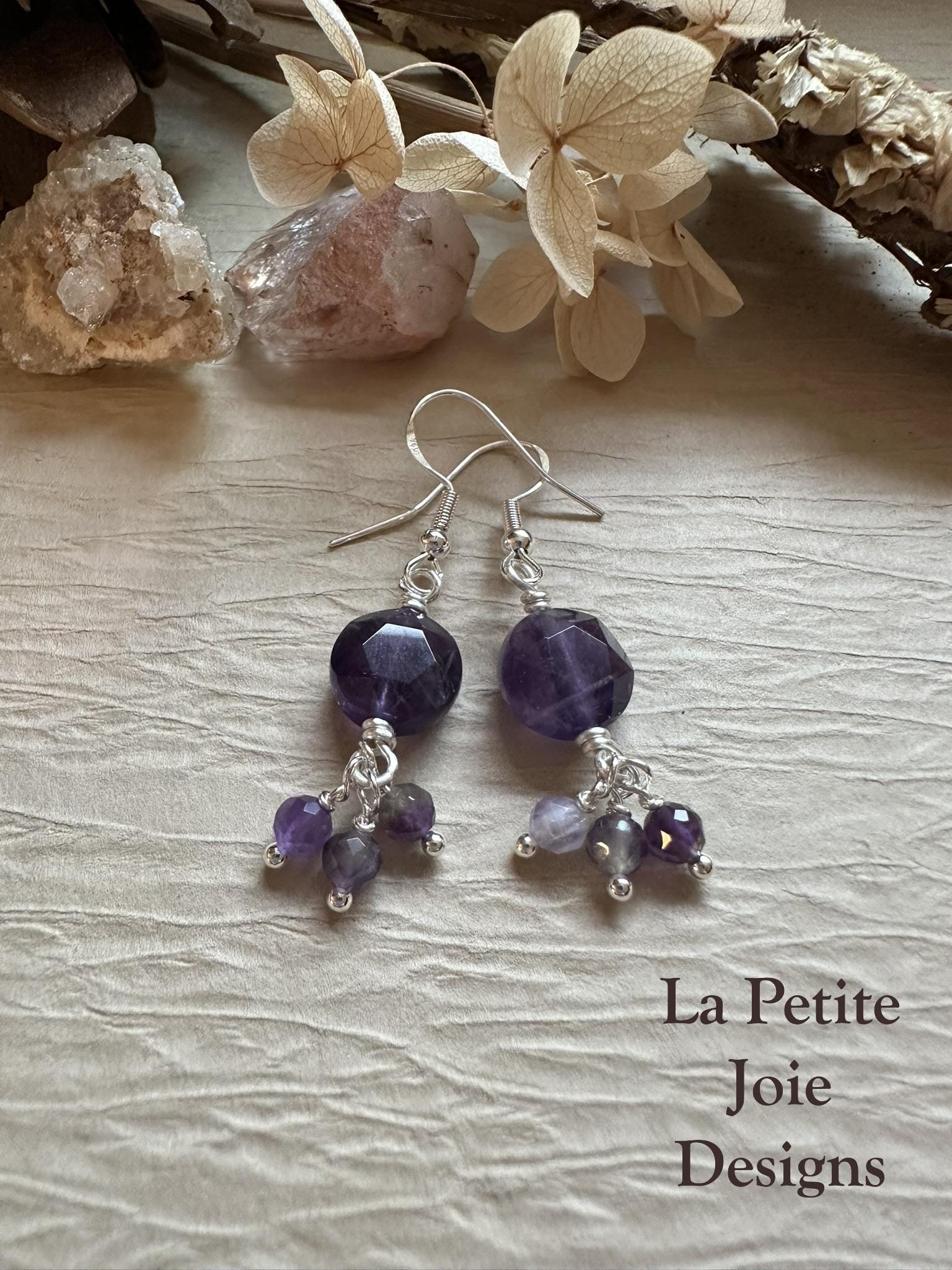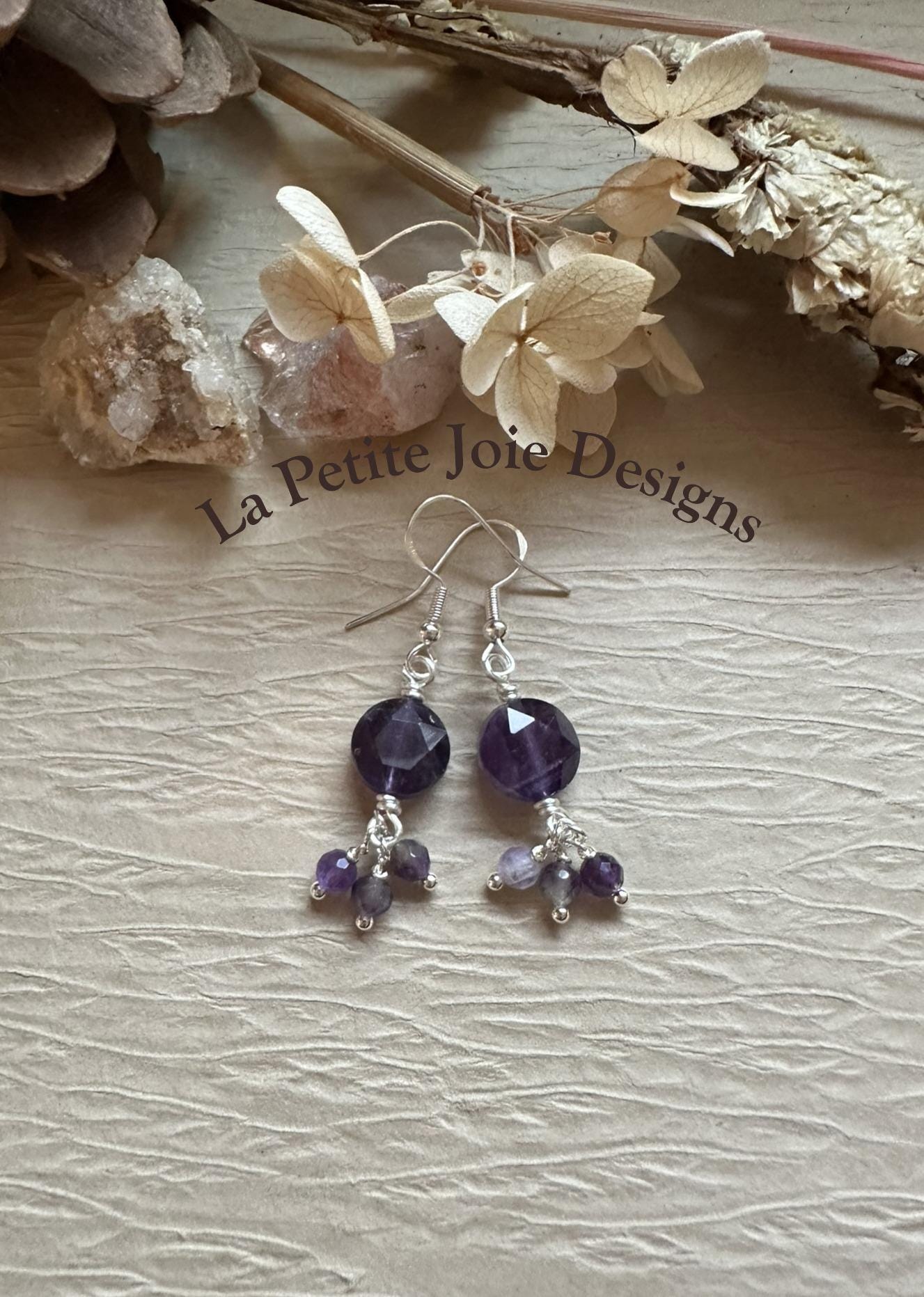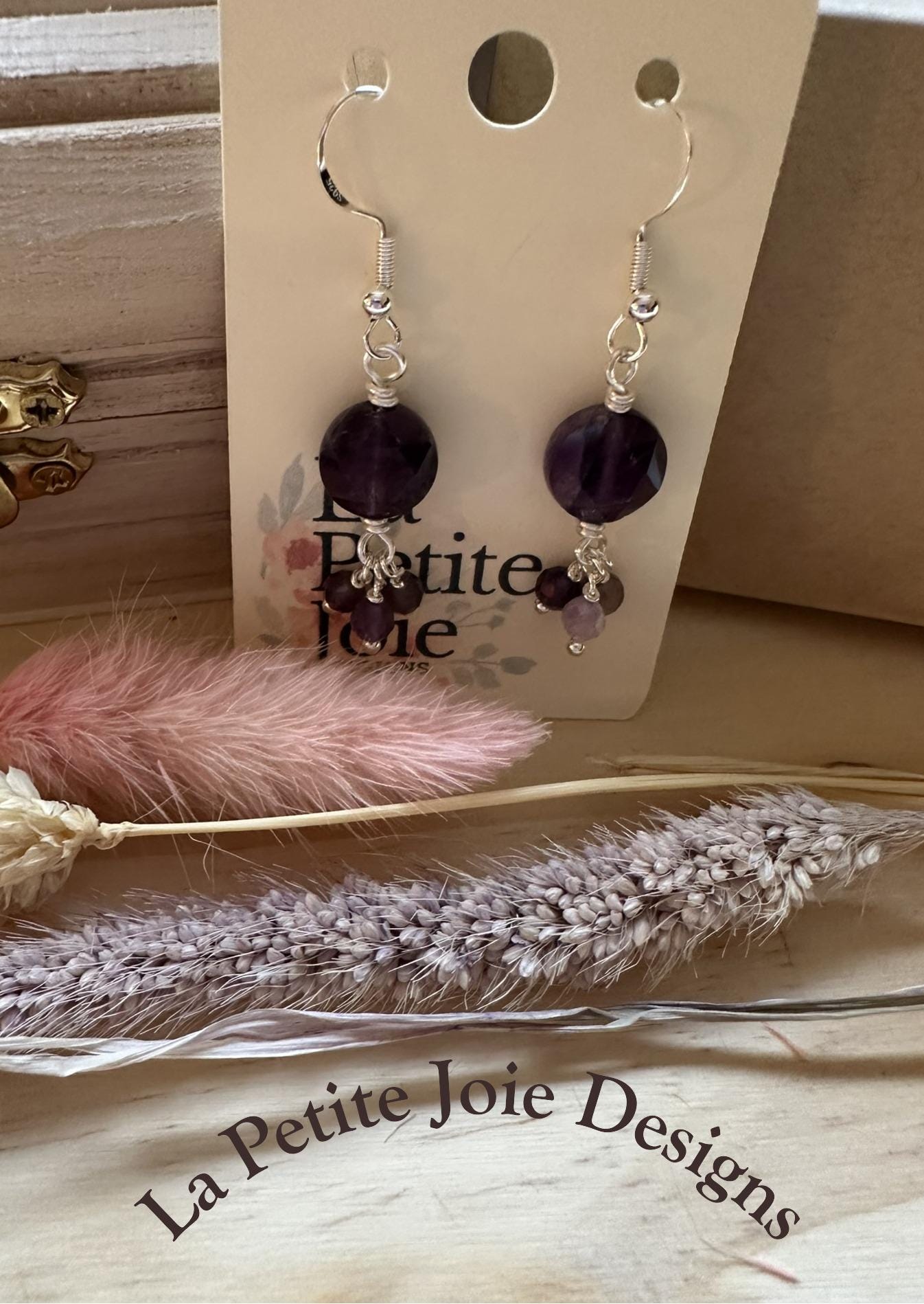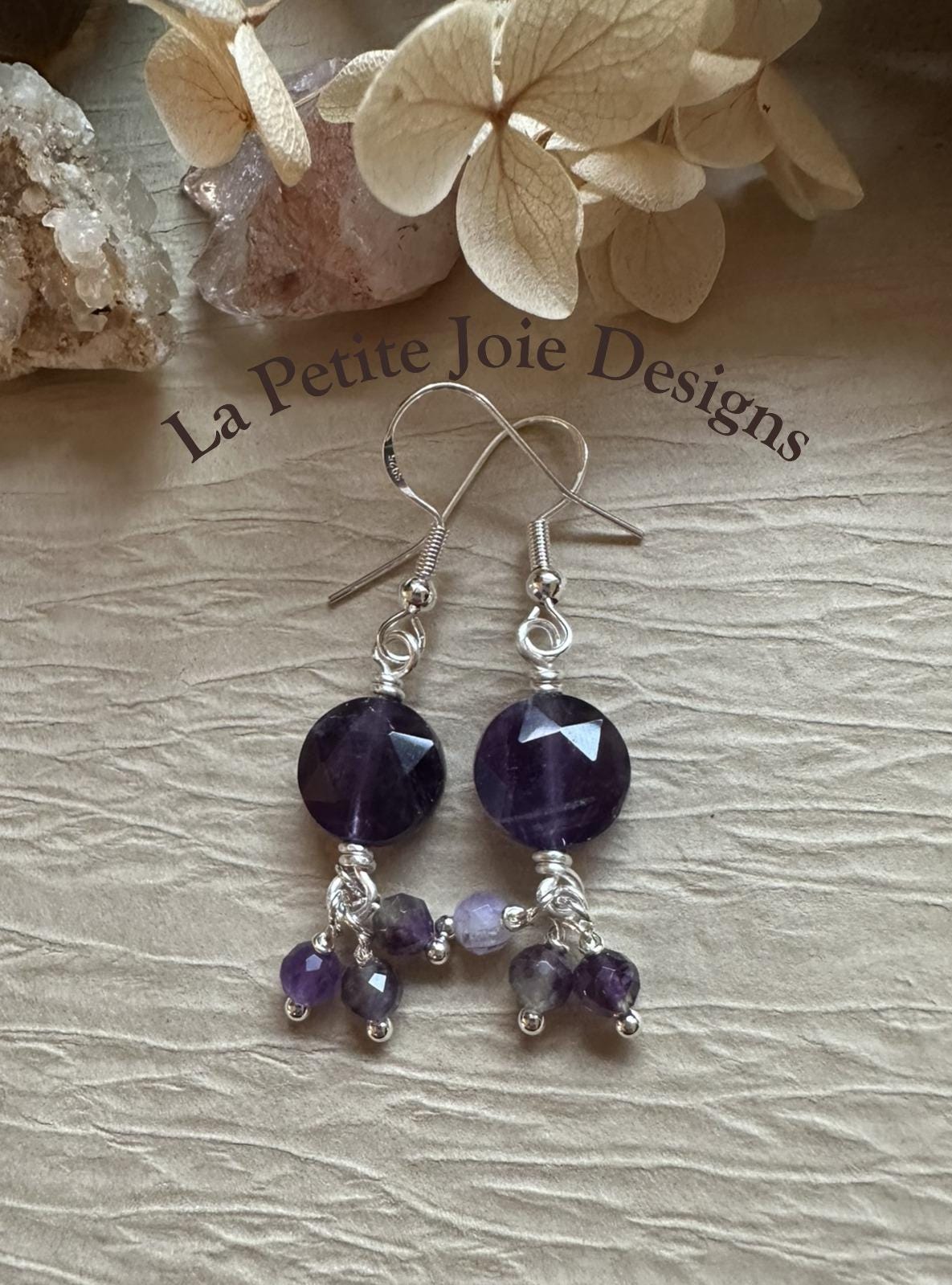 Add a touch of purple sparkle with these amethyst faceted coin drop earrings, accented with three tiny, 3mm faceted amethyst dangles beneath. Lightweight and elegant, they catch the light beautifully and offer the perfect pop of dark violet for everyday wear or special occasions. Ideal as a February birthstone gift, boho chic accessory, or gemstone earring for lovers of natural crystal jewelry.