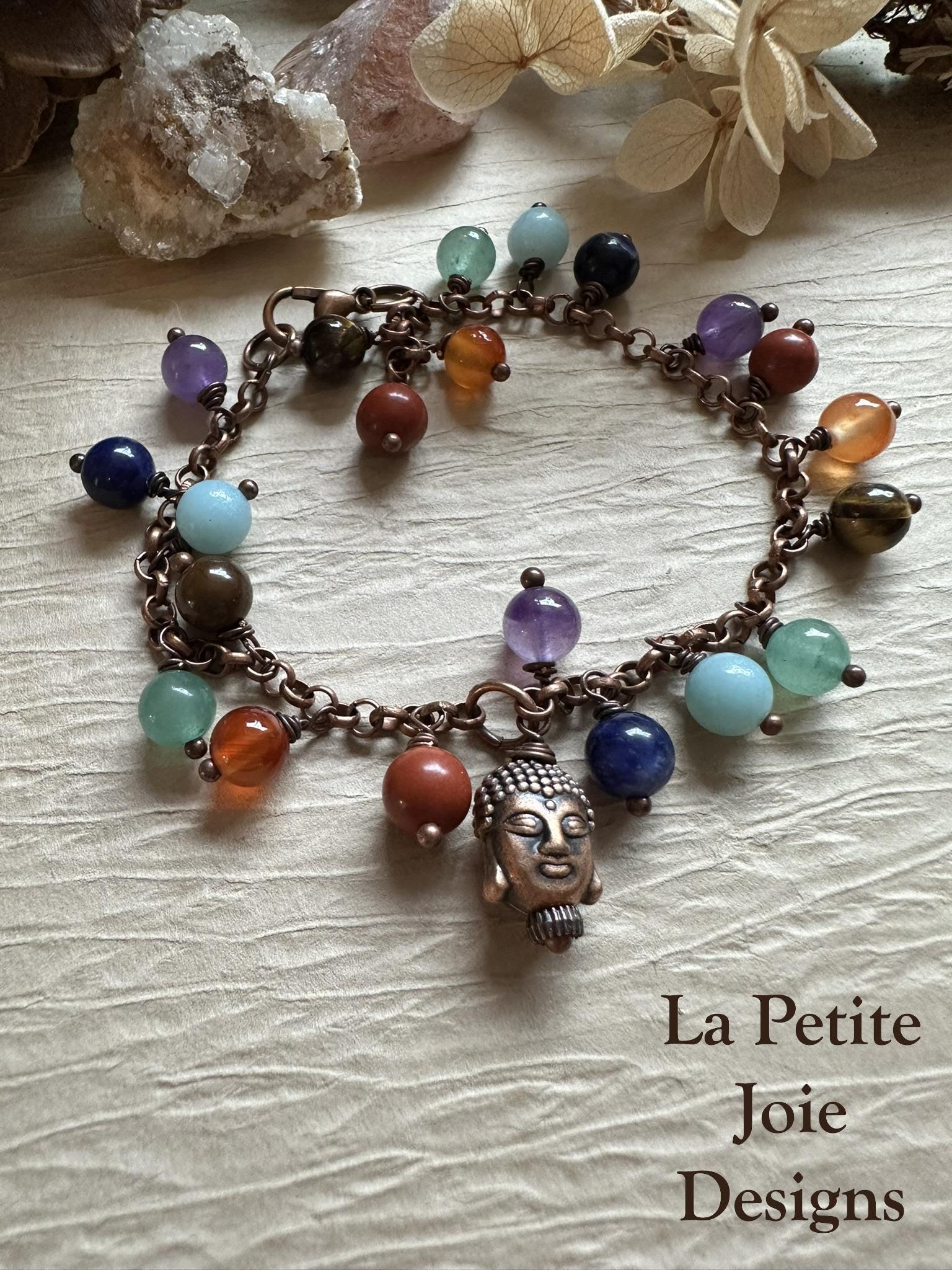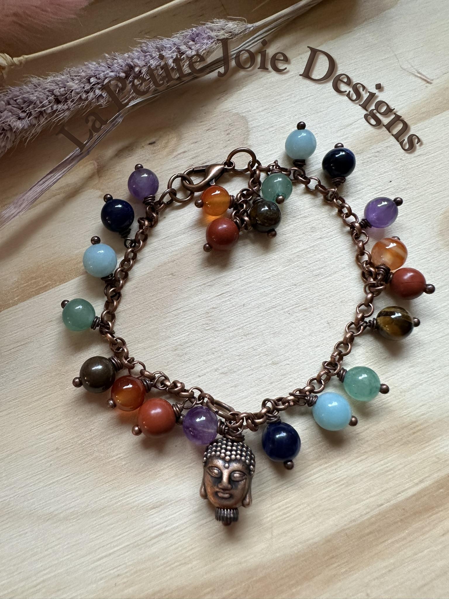 Bring balance, mindfulness, and earthy style to your everyday look with this handcrafted chakra bracelet, featuring smooth round gemstones paired with a rustic antique copper Buddha bead. Each stone was selected to represent the seven chakras; creating a harmonious blend of grounding neutrals and colors meant to inspire clarity an calm.