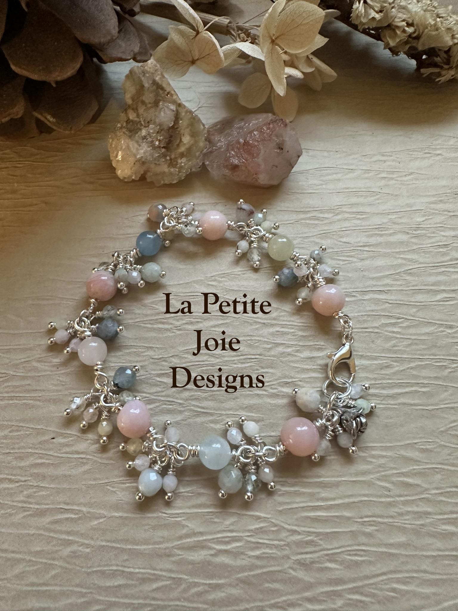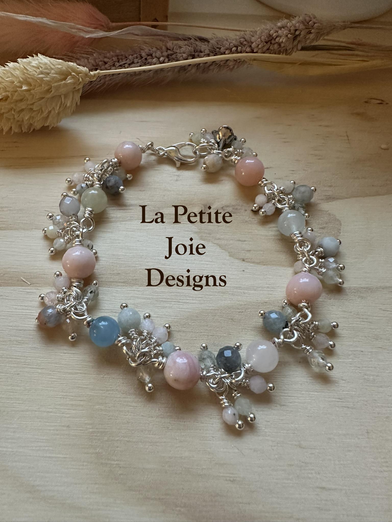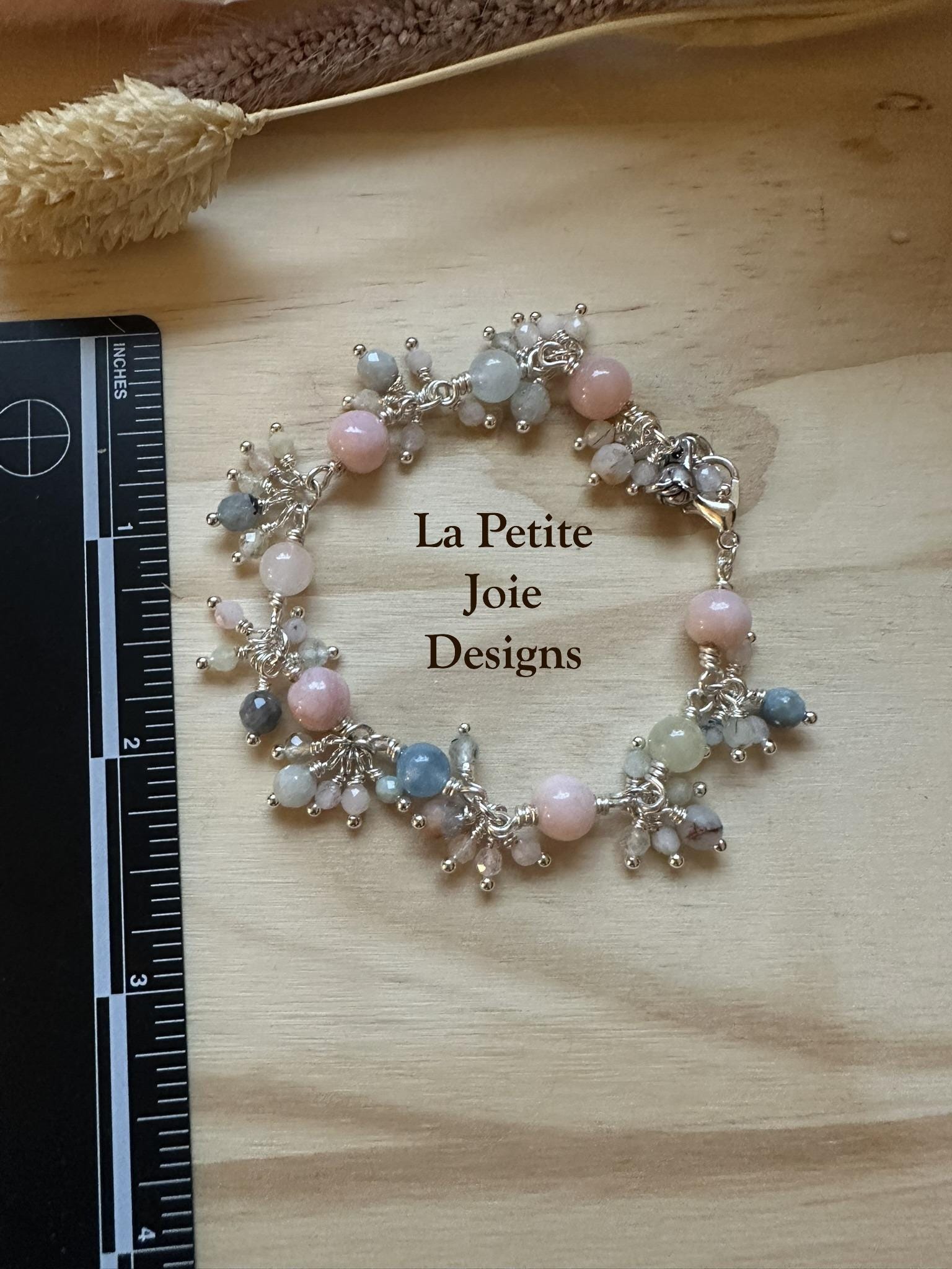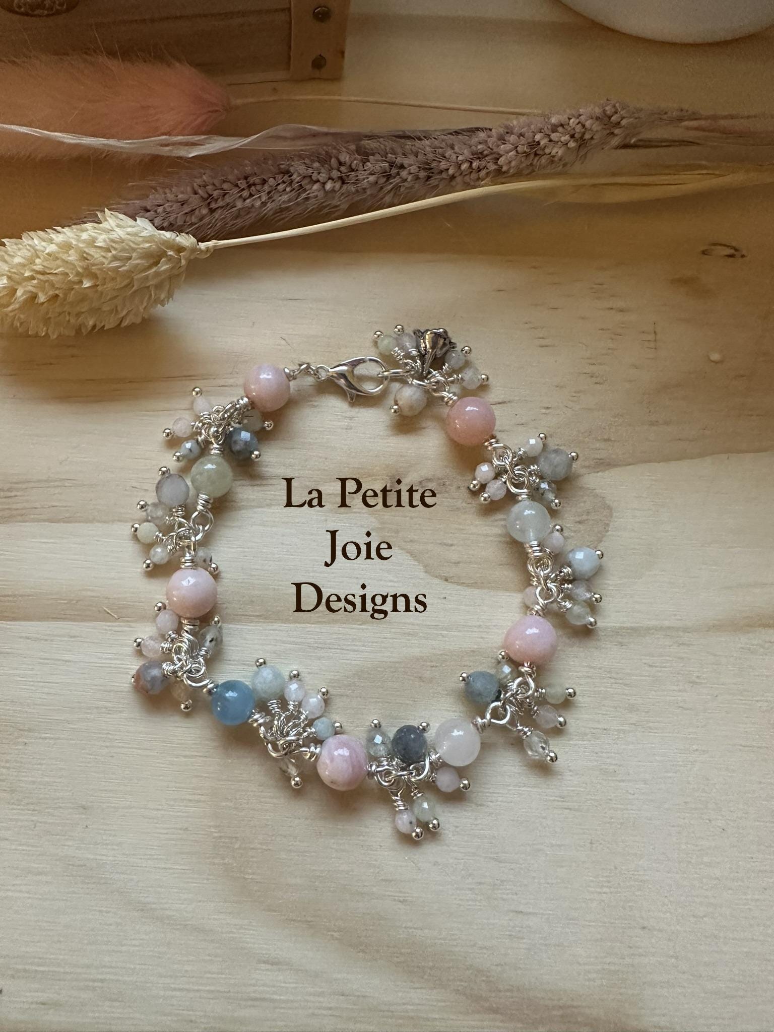 This graceful, silver wire-wrapped bracelet features a romantic blend of soft, blush pink and blue Morganite and Peruvian pink opal, creating a delicate balance of warmth and serenity. Each gemstone is carefully wrapped in silver-tone wire, with gentle movement added by faceted morganite and aquamarine dangles that catch the light with subtle sparkle. The pastel palette of pale pinks and airy aqua blues gives this bracelet an ethereal feel, making it a beautiful choice for everyday wear, special occasions, or layered styling.