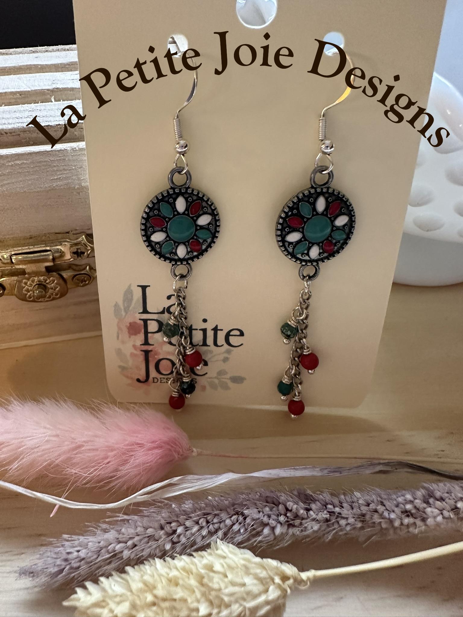 The combination of bold enamel, cool silver, and earthy gemstones creates a lively, artisan-inspired look with a hint of southwestern and boho charm. Lightweight and expressive, these earrings are perfect for adding a pop of color to everyday outfits or for wearing as a statement piece during warmer seasons. Perfect for those who love colorful jewelry, floral designs, and handcrafted gemstone earrings, this pair makes a beautiful gift or a vibrant addition to your personal collection.
