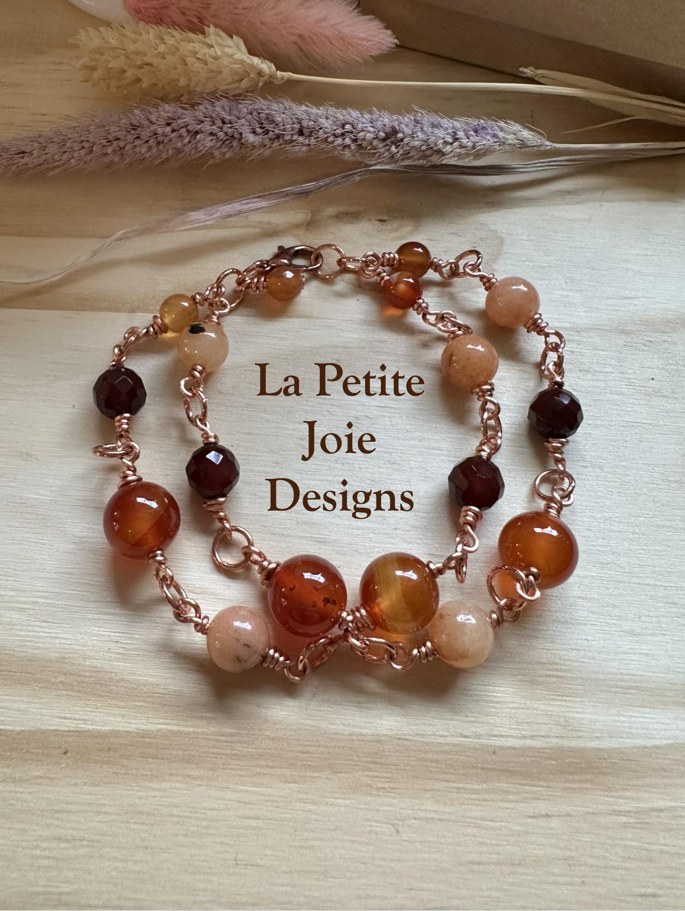 This handcrafted Carnelian and Sunstone bracelet features a beautifully balanced two-strand design, with each gemstone individually wire-wrapped in warm copper-colored wire. The Carnelian beads display a stunning range of color—from soft, light orange to rich, deep red—while the Sunstone beads add contrast with their gentle tan-orange glow and subtle warmth.