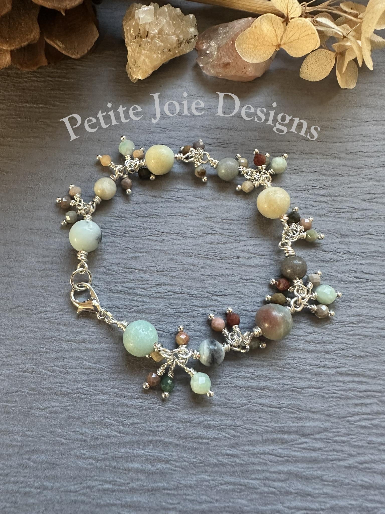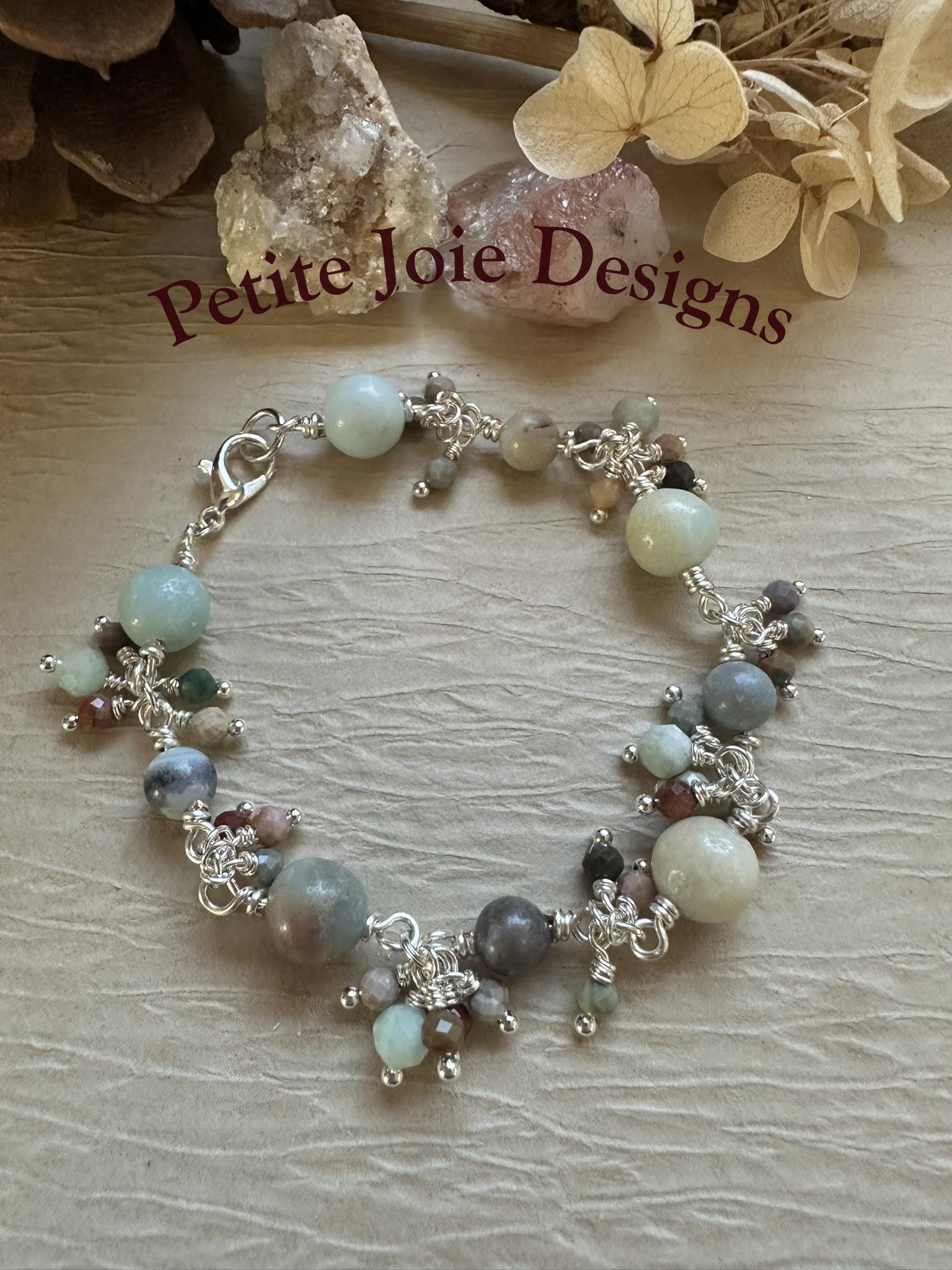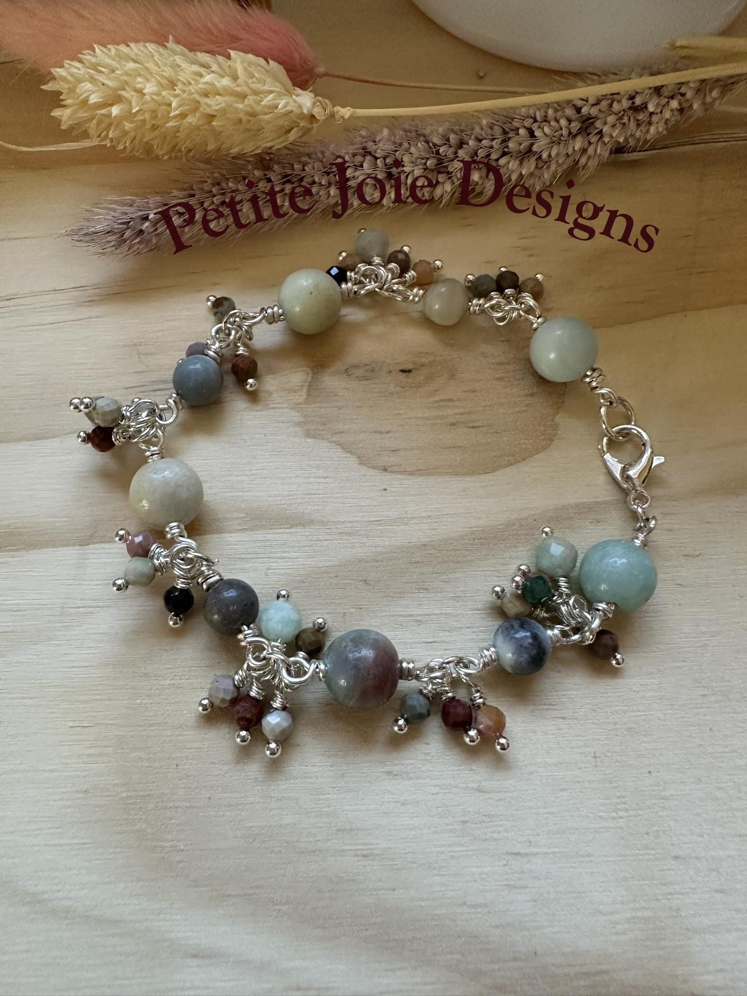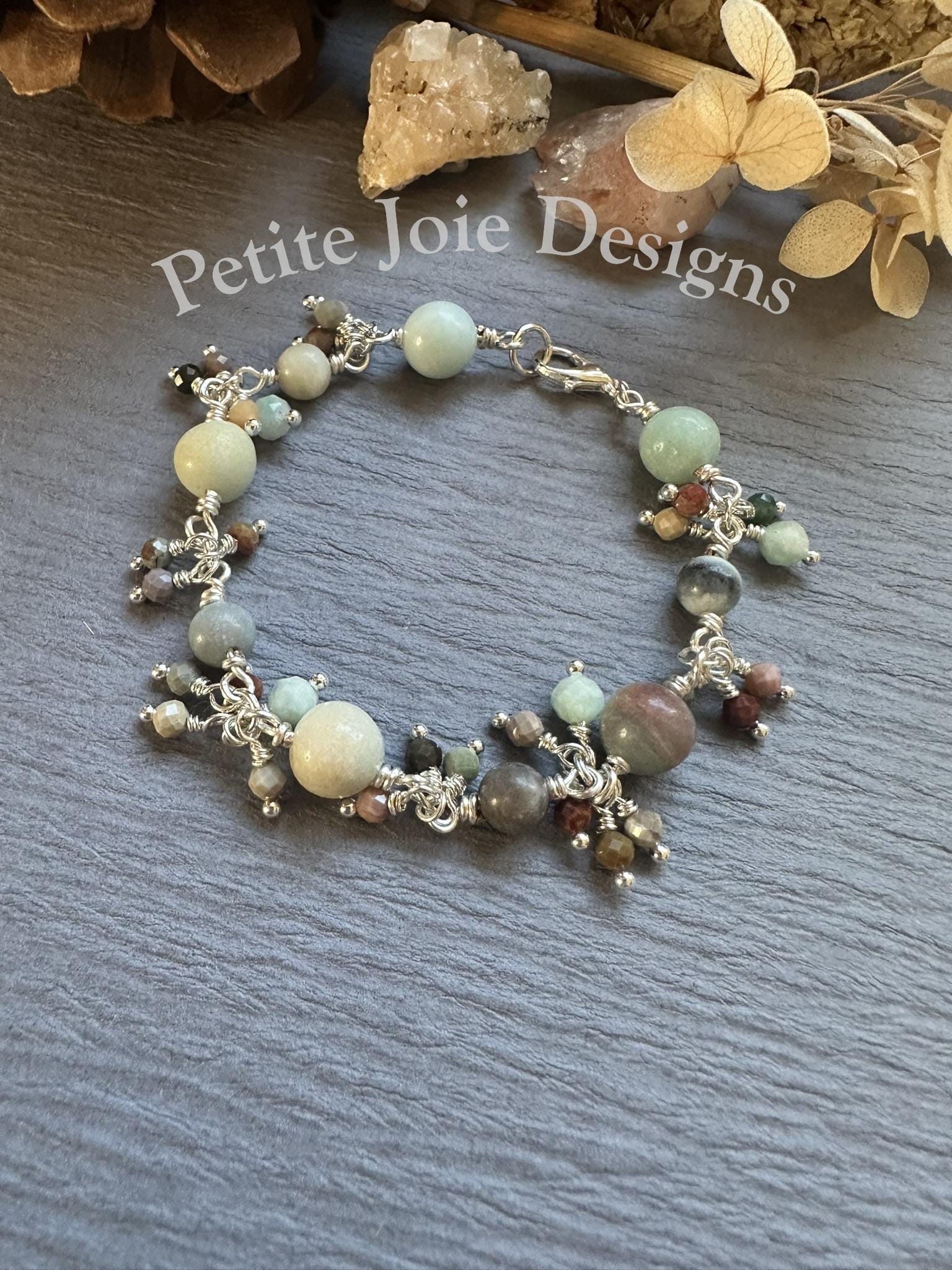 Handcrafted Amazonite (Black Gold) bracelet featuring smooth, round Amazonite beads in soft light blue, gray, and warm tan tones, each individually wire-wrapped in silver-plated wire. Between the Amazonite beads, delicate Alashan Agate dangles add subtle movement and visual interest, creating a layered design that feels both elegant and earthy. The cool sheen of silver beautifully complements the natural color variations of the Amazonite, while the Alashan Agate accents provide gentle contrast and texture. Lightweight and comfortable, this bracelet is perfect for everyday wear or for layering with other gemstone pieces.