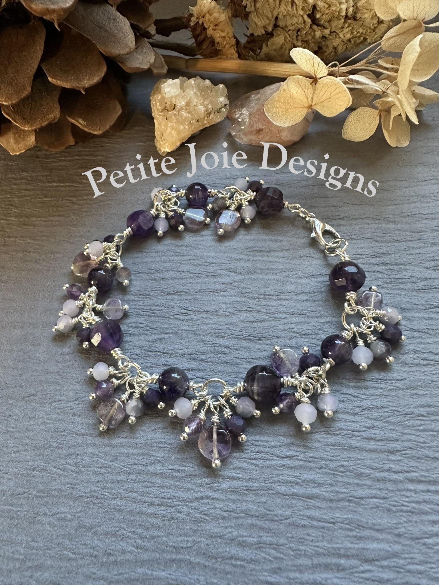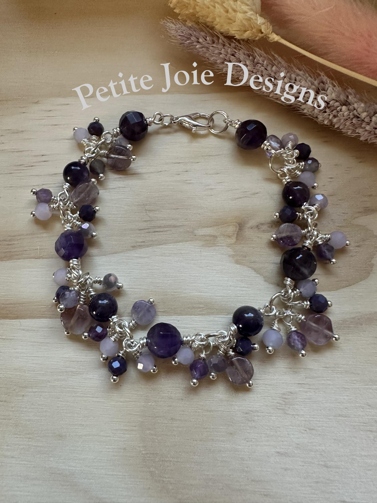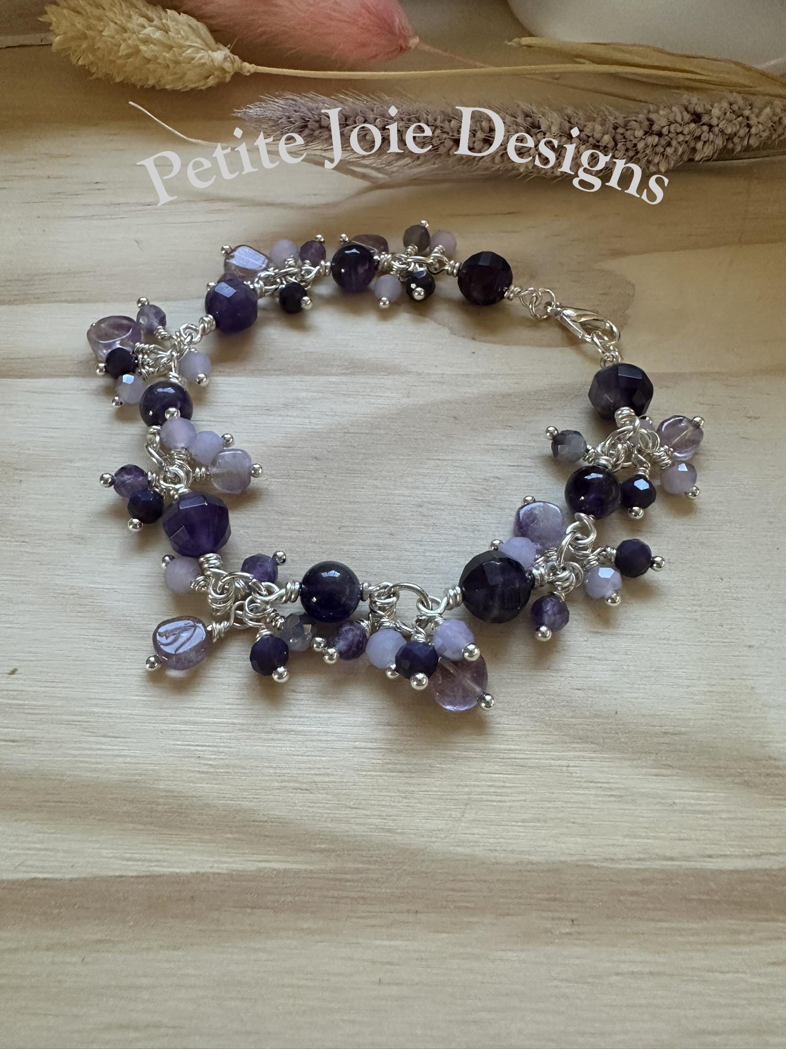 Handcrafted amethyst bracelet featuring a blend of smooth and faceted round Amethyst beads, each individually wire-wrapped in silver-plated wire. Between the wire-wrapped beads, delicate Amethyst dangles in both deep violet and soft lavender tones are paired with lavender glass dangles, adding graceful movement, shimmer, and layered texture.