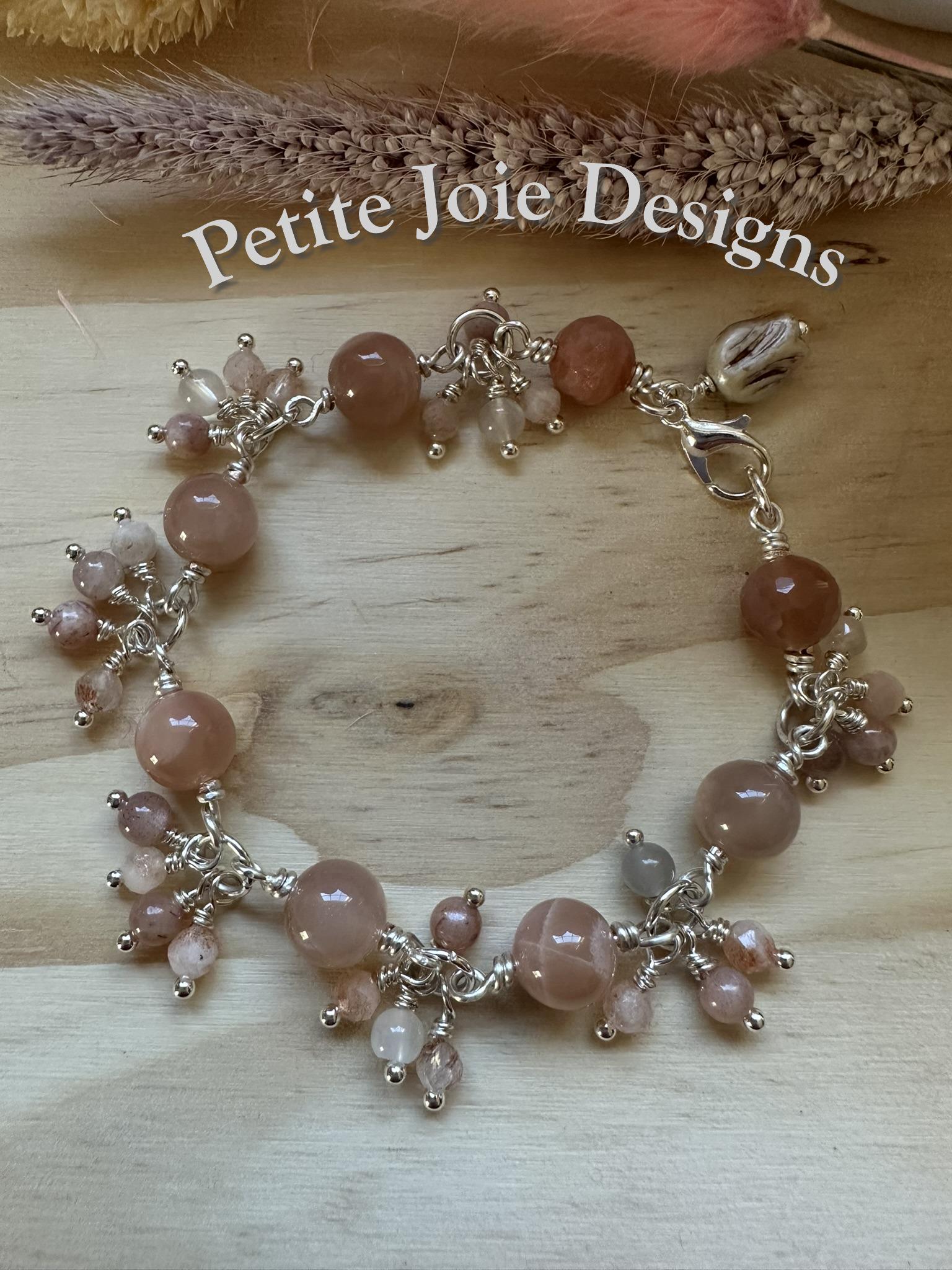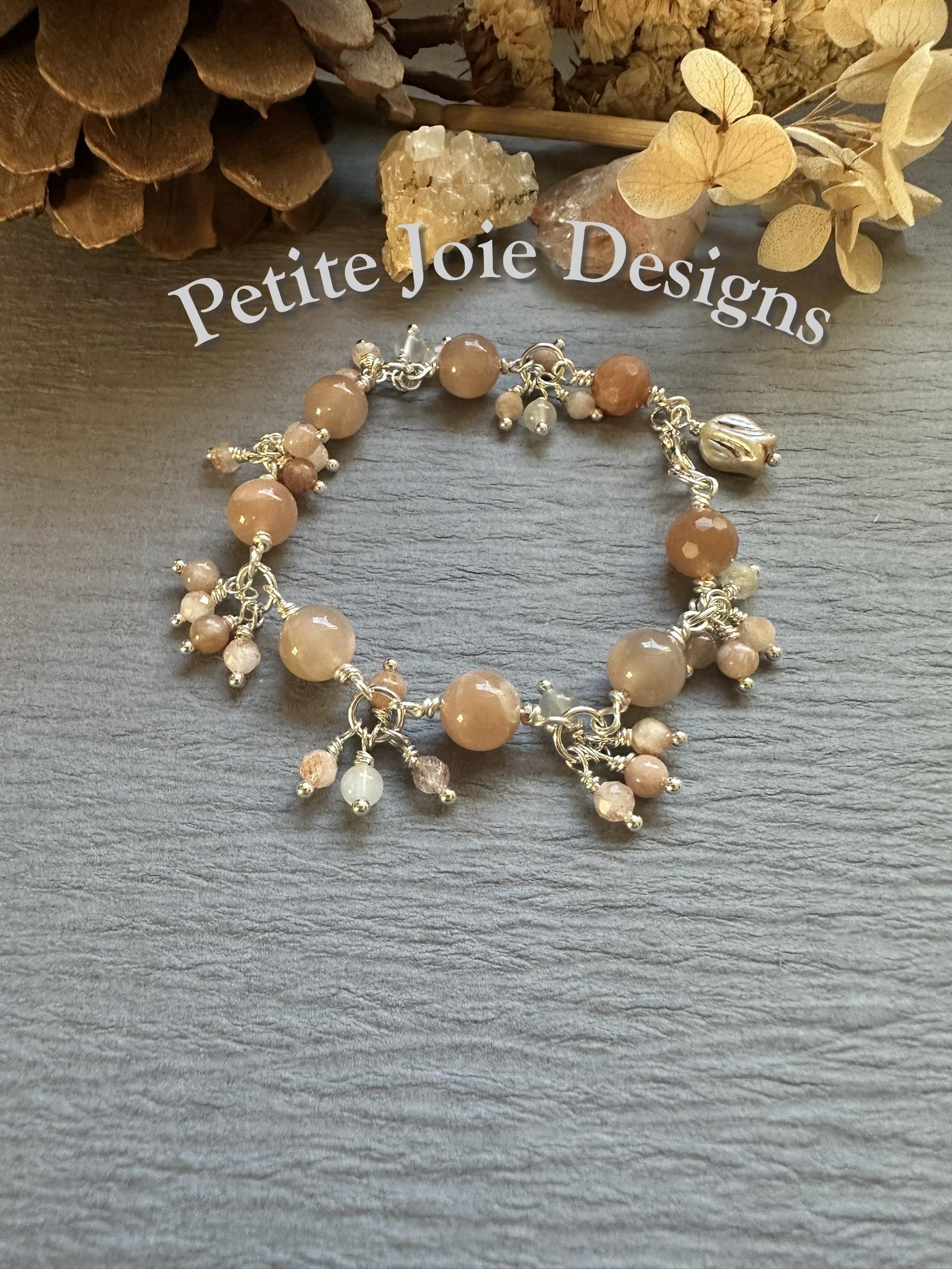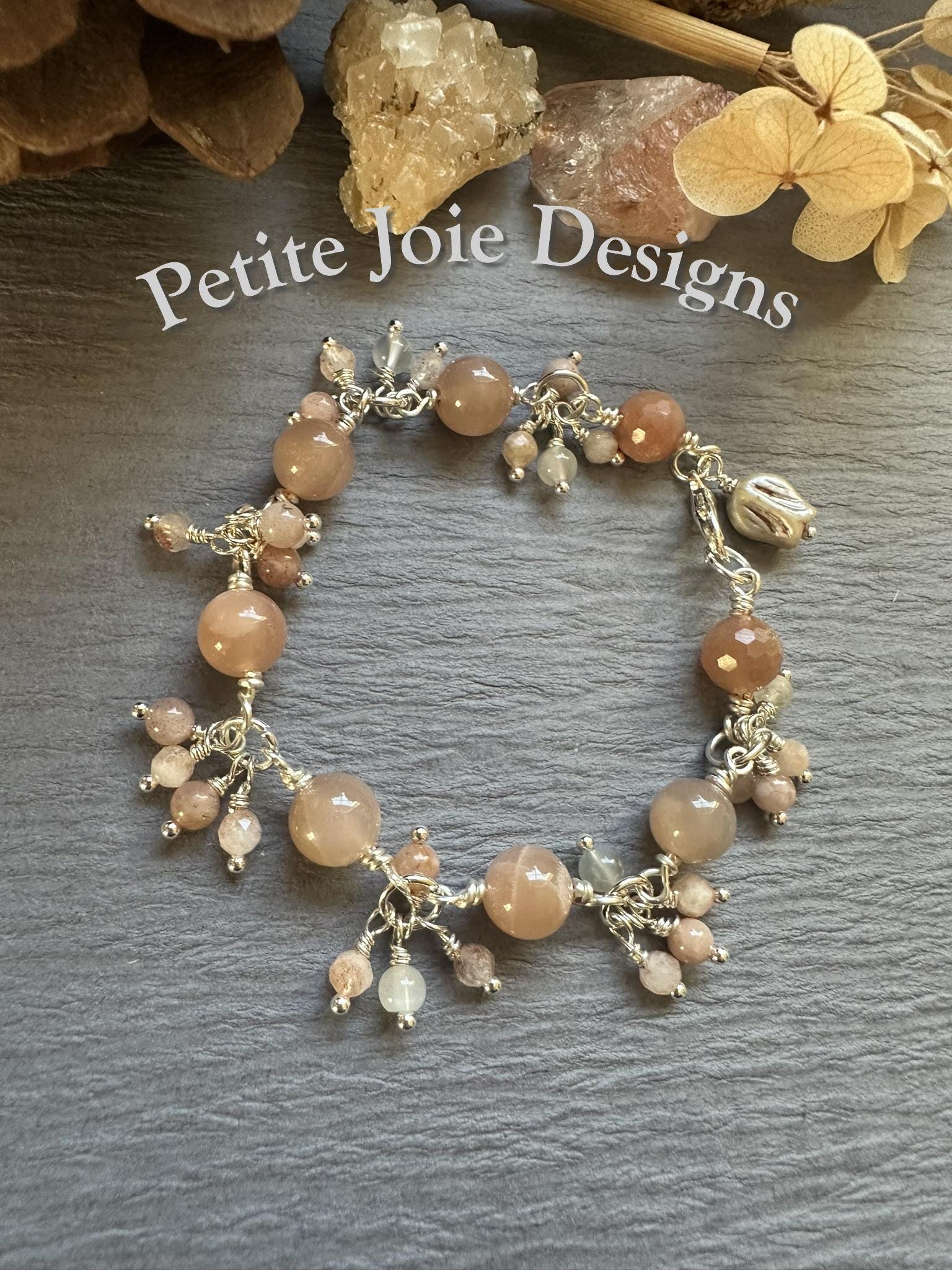Handcrafted peach moonstone and sunstone bracelet featuring softly glowing peach moonstone beads paired with warm, shimmering sunstone accents, each individually wire-wrapped for an elegant, balanced design. The gentle blush and peach tones of moonstone are complemented by the golden sparkle of sunstone, creating a bracelet that feels both luminous and earthy.