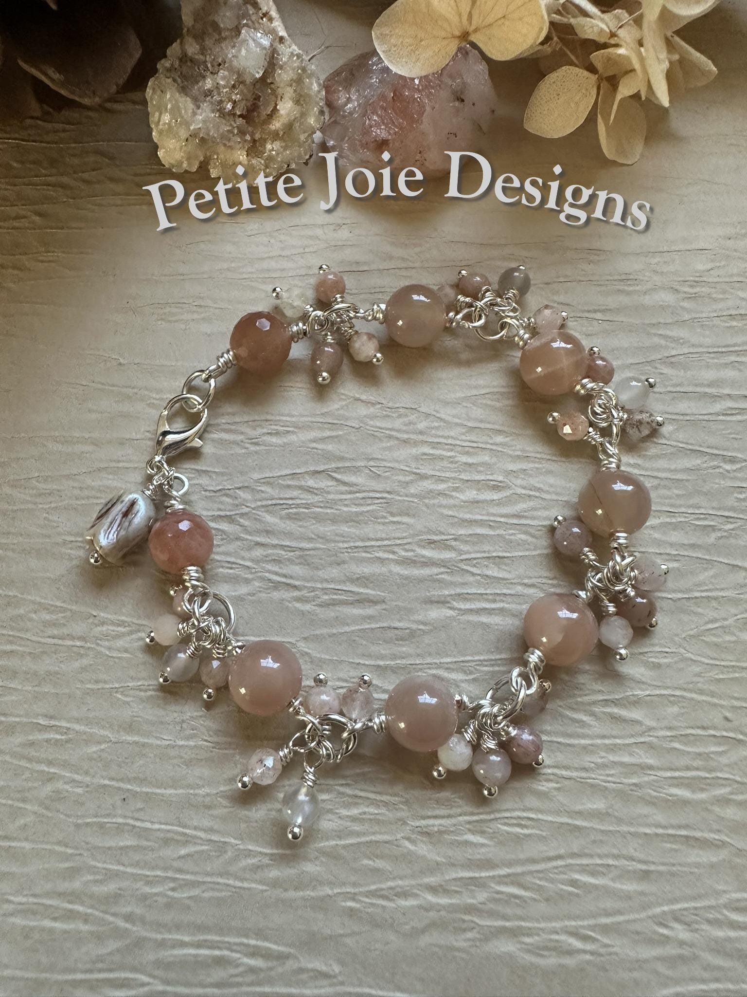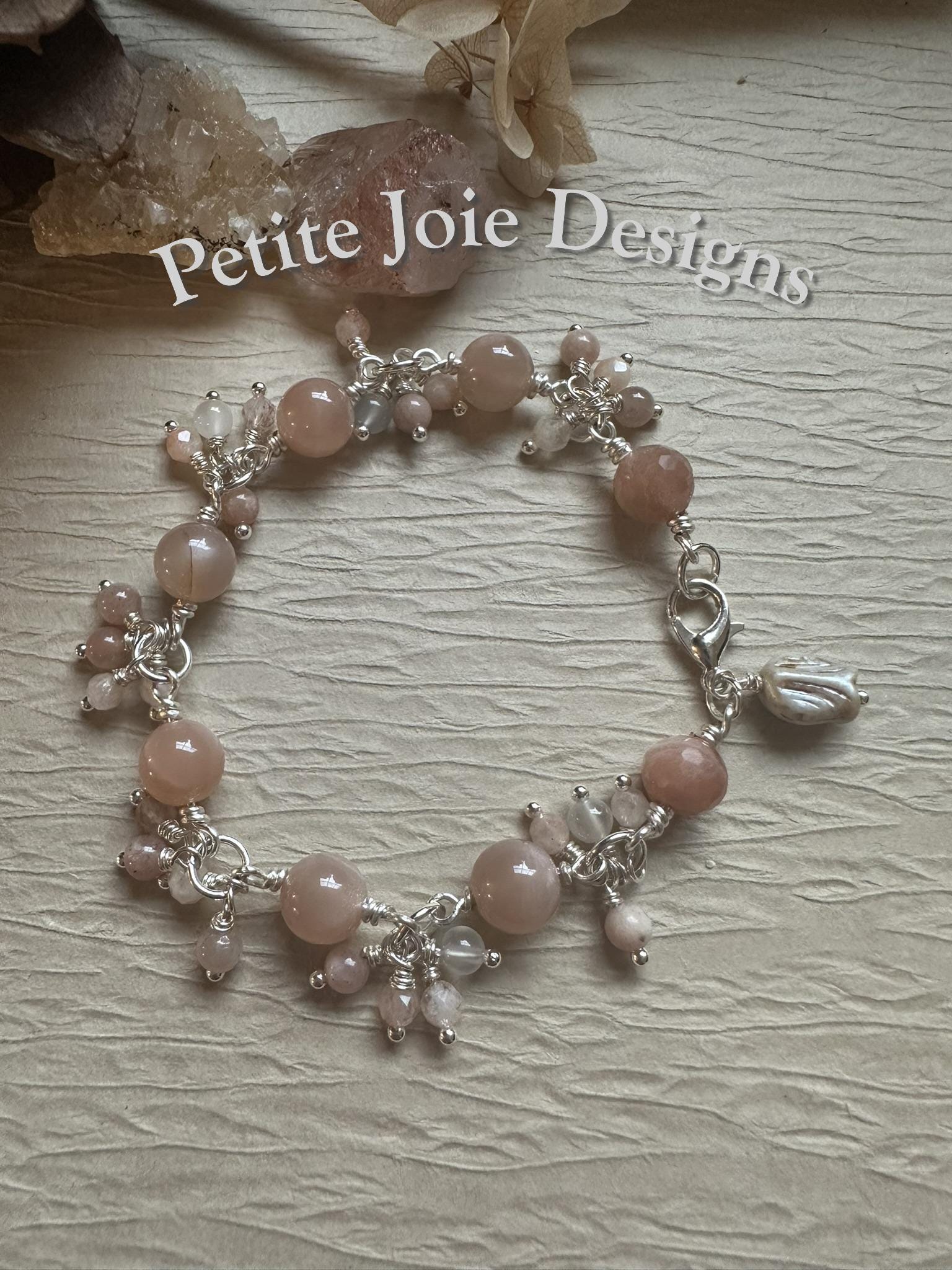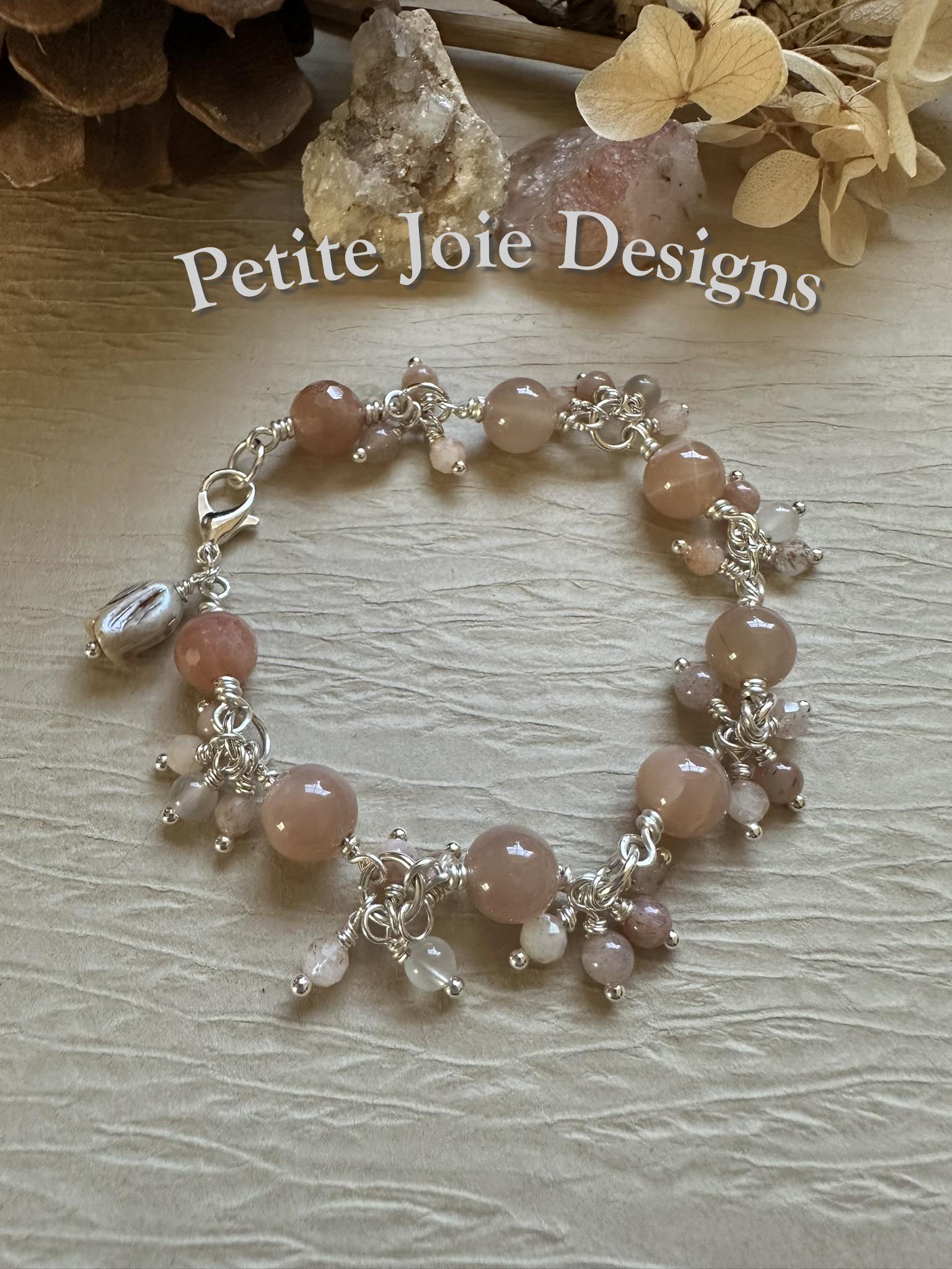 Handcrafted peach moonstone and sunstone bracelet featuring softly glowing peach moonstone beads paired with warm, shimmering sunstone accents, each individually wire-wrapped for an elegant, balanced design. The gentle blush and peach tones of moonstone are complemented by the golden sparkle of sunstone, creating a bracelet that feels both luminous and earthy.