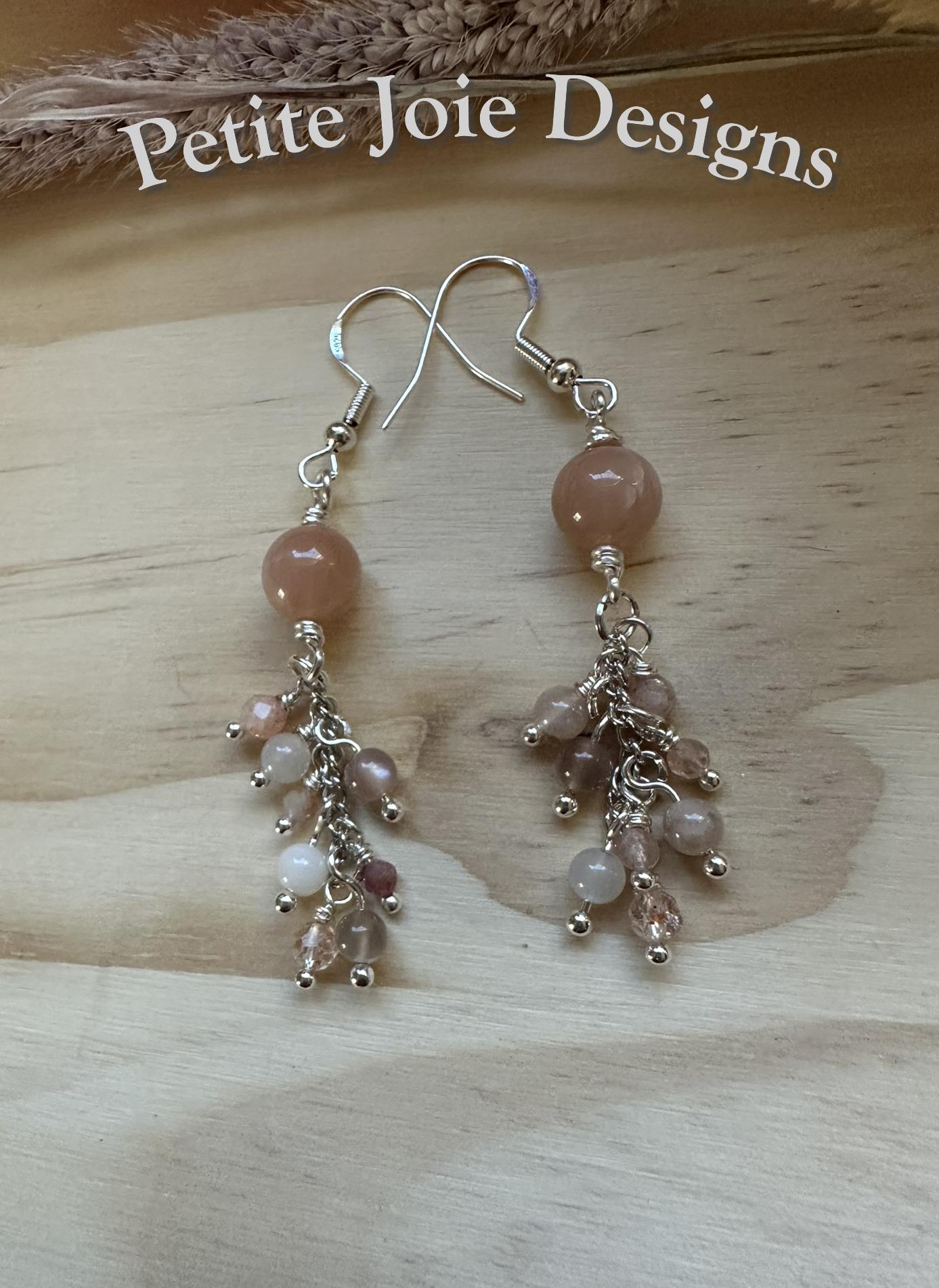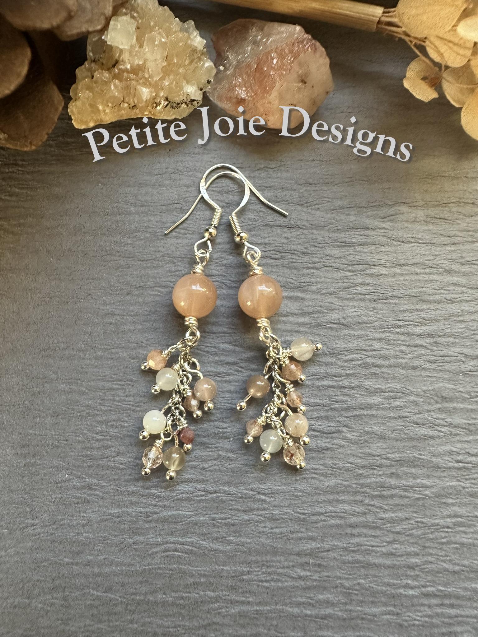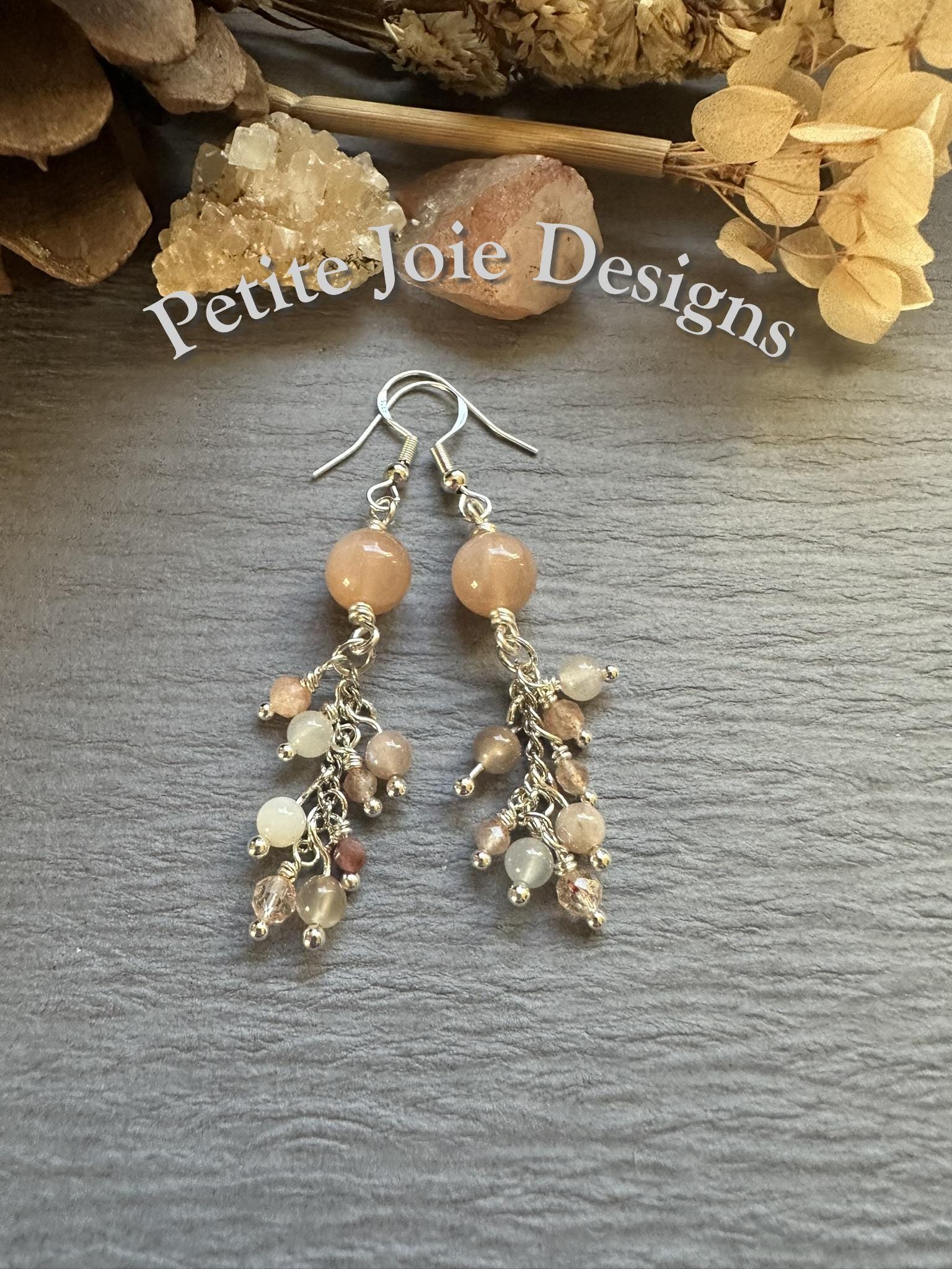 These handcrafted drop earrings are made with soft, peach moonstone and luminous sunstone, wrapped in bright silver wire for a light, elegant finish. At the top of each earring sits an 8mm, smooth peach moonstone bead, glowing with gentle warmth and subtle sheen.