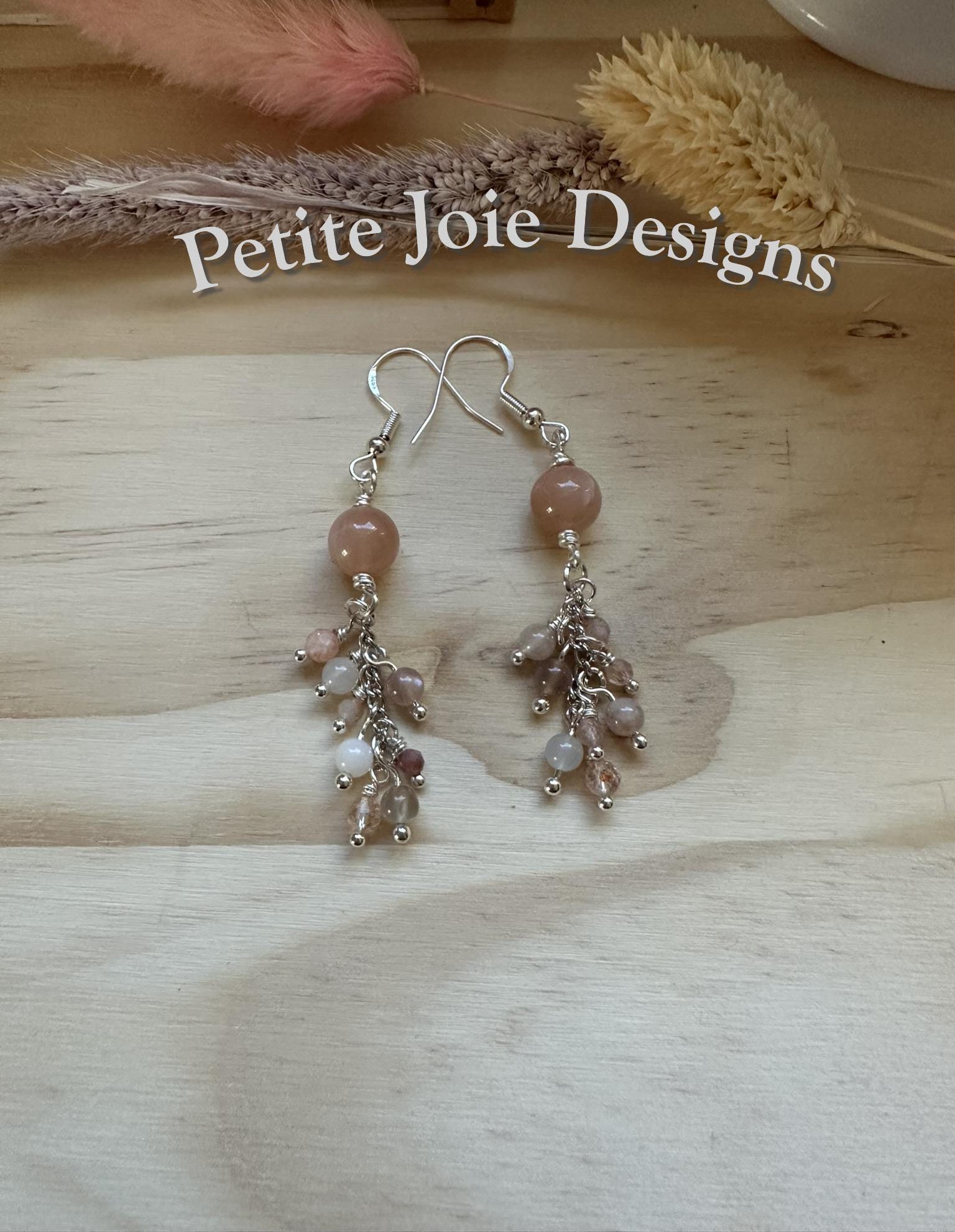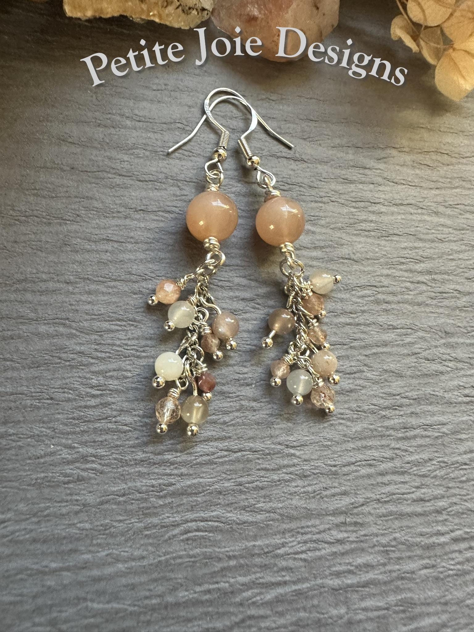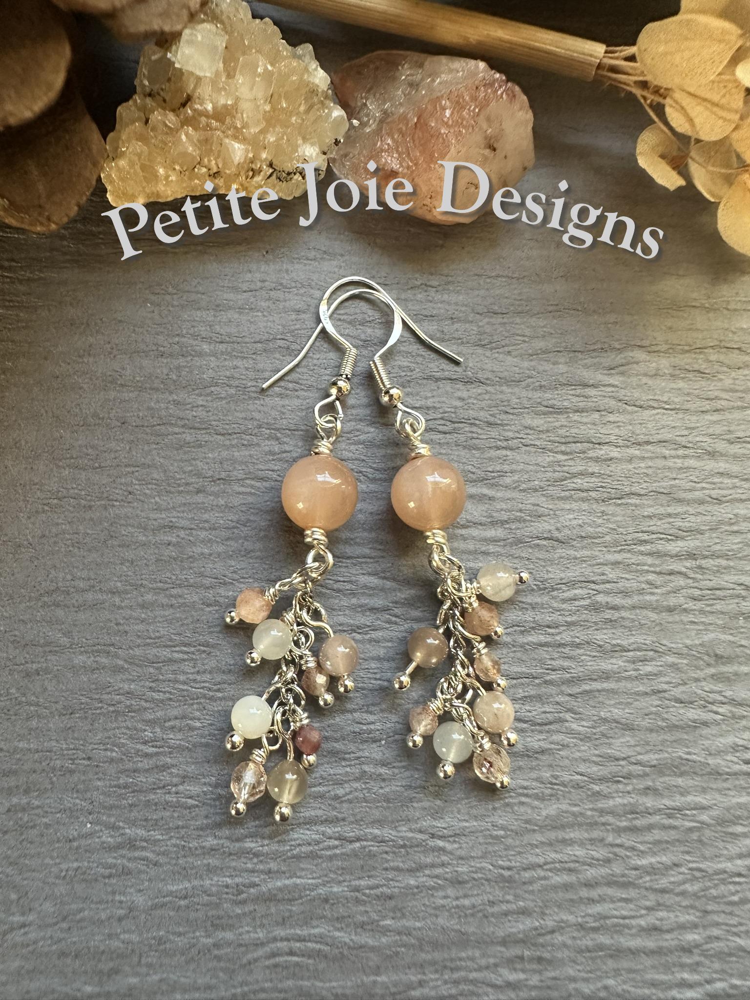 These handcrafted drop earrings are made with soft, peach moonstone and luminous sunstone, wrapped in bright silver wire for a light, elegant finish. At the top of each earring sits an 8mm, smooth peach moonstone bead, glowing with gentle warmth and subtle sheen.